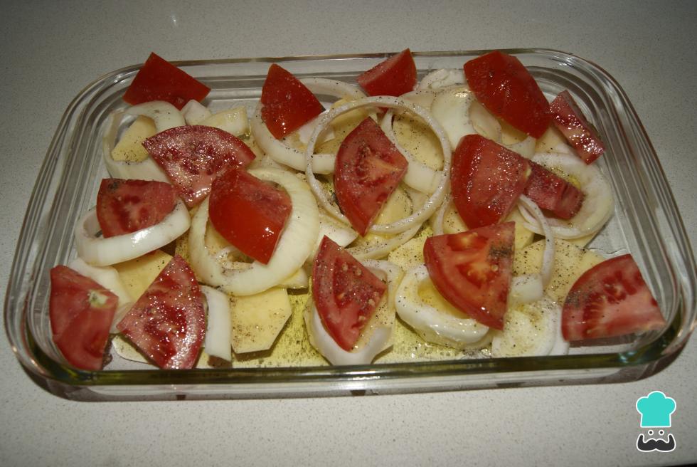 Corta la cebolla en aros y colócala sobre las patatas como se ve en la fotografía.