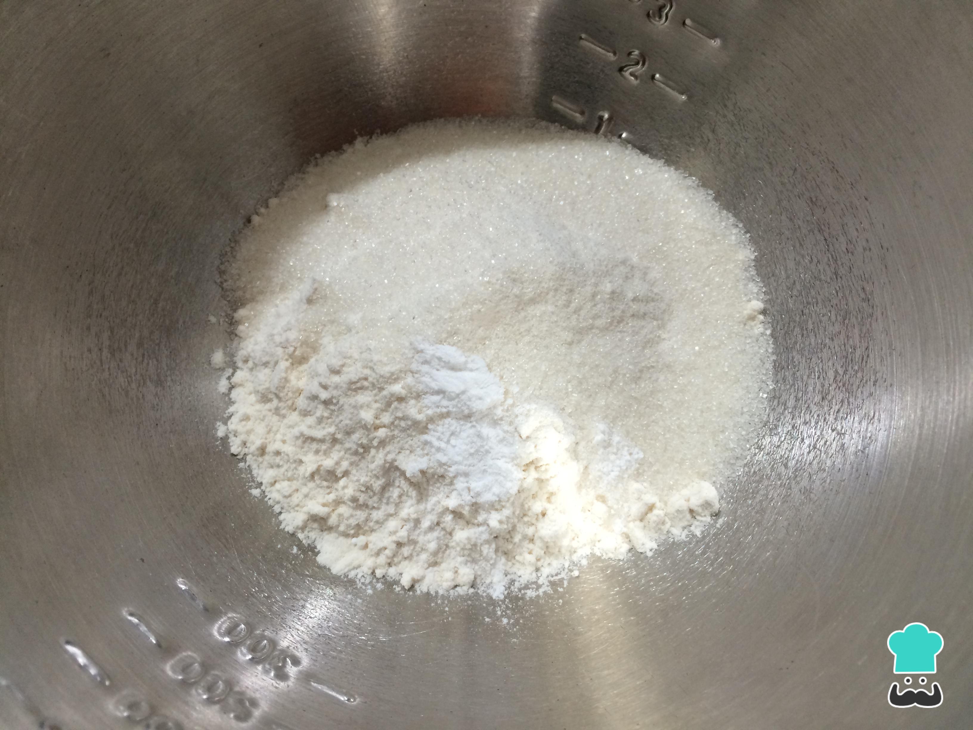 En un bol mezcla la harina, el polvo de hornear y el azúcar para empezar a preparar la masa.