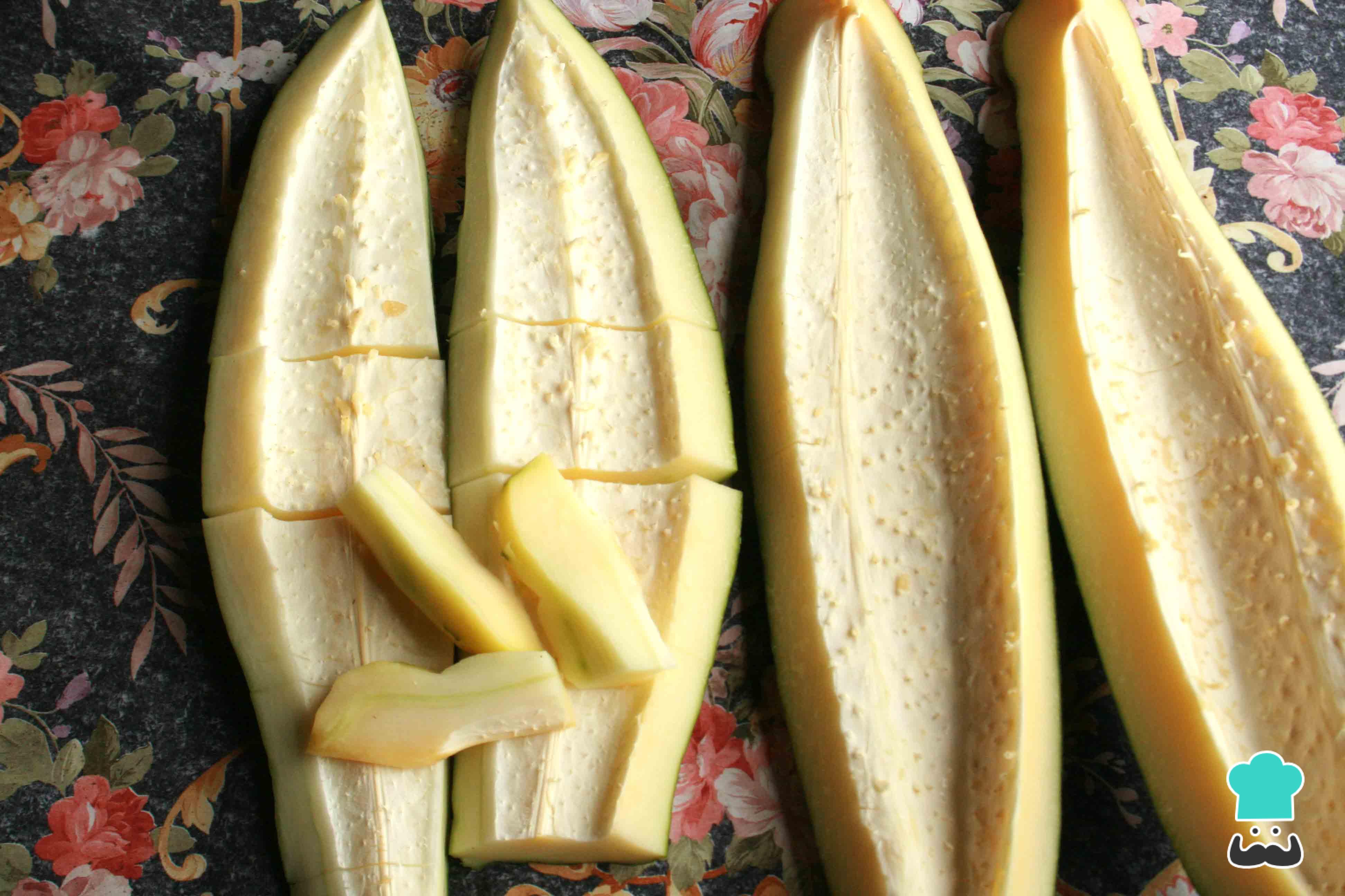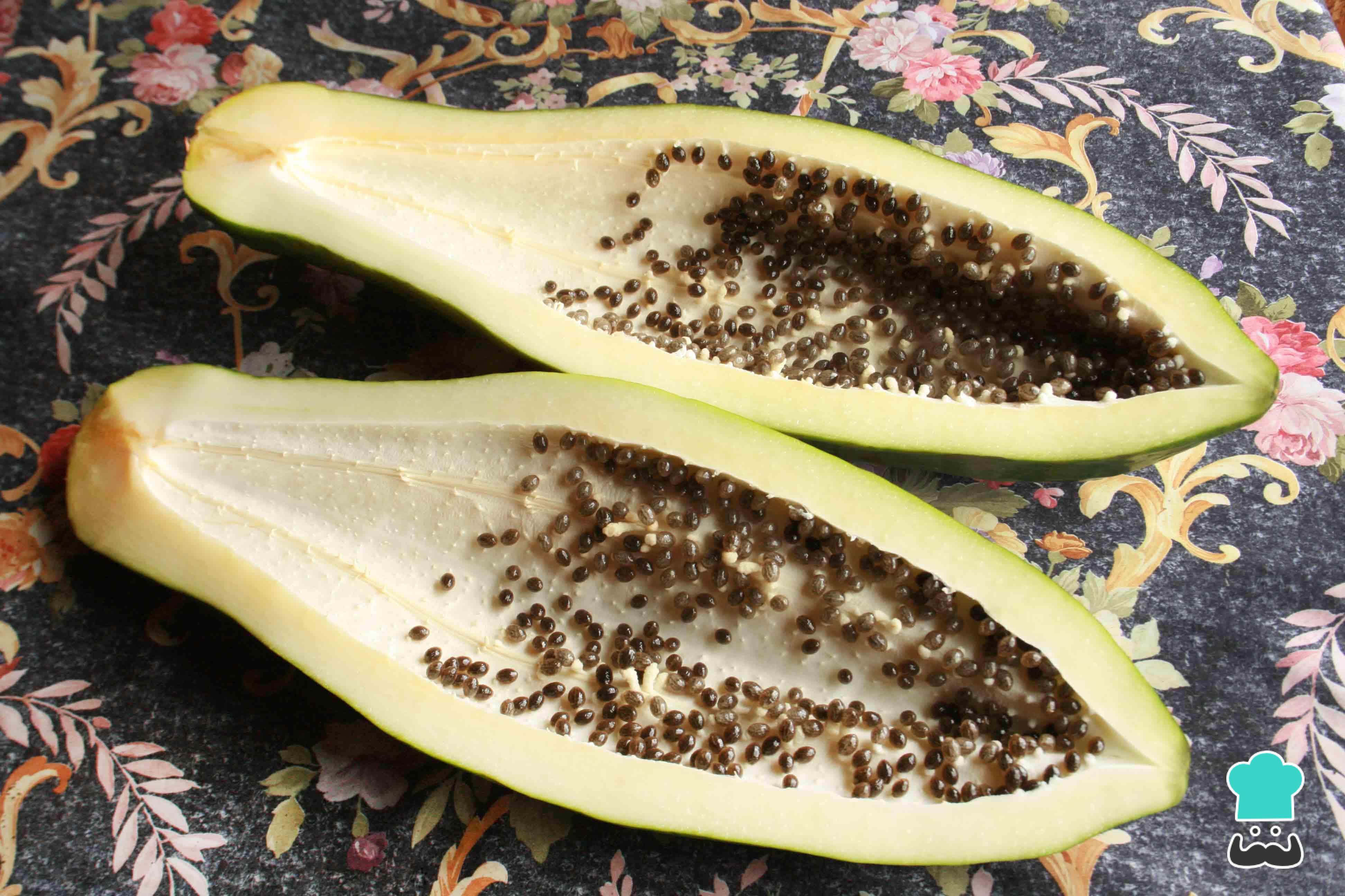 Lava la lechosa, retira la concha. Luego, parte a la mitad a lo largo. Retira las semillas.