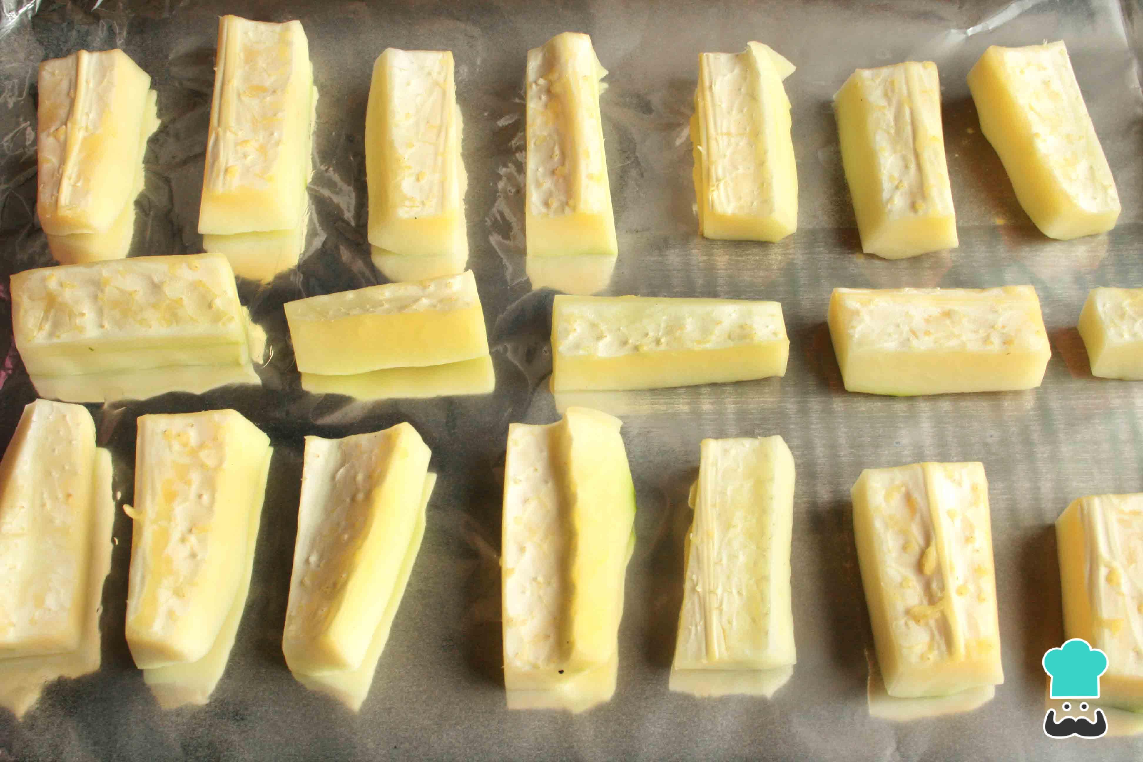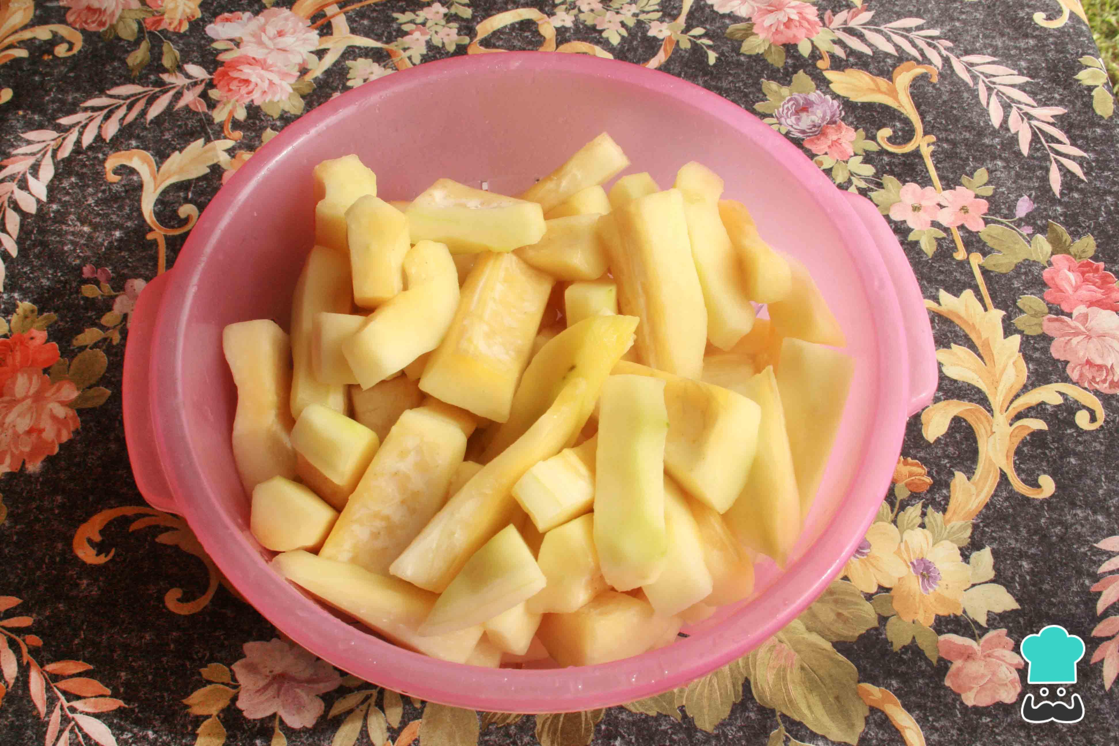 Divide la lechosa en partes y corta a la juliana. Cada trozo no debe ser muy pequeño ni muy grande, ni muy delgado ni muy grueso.