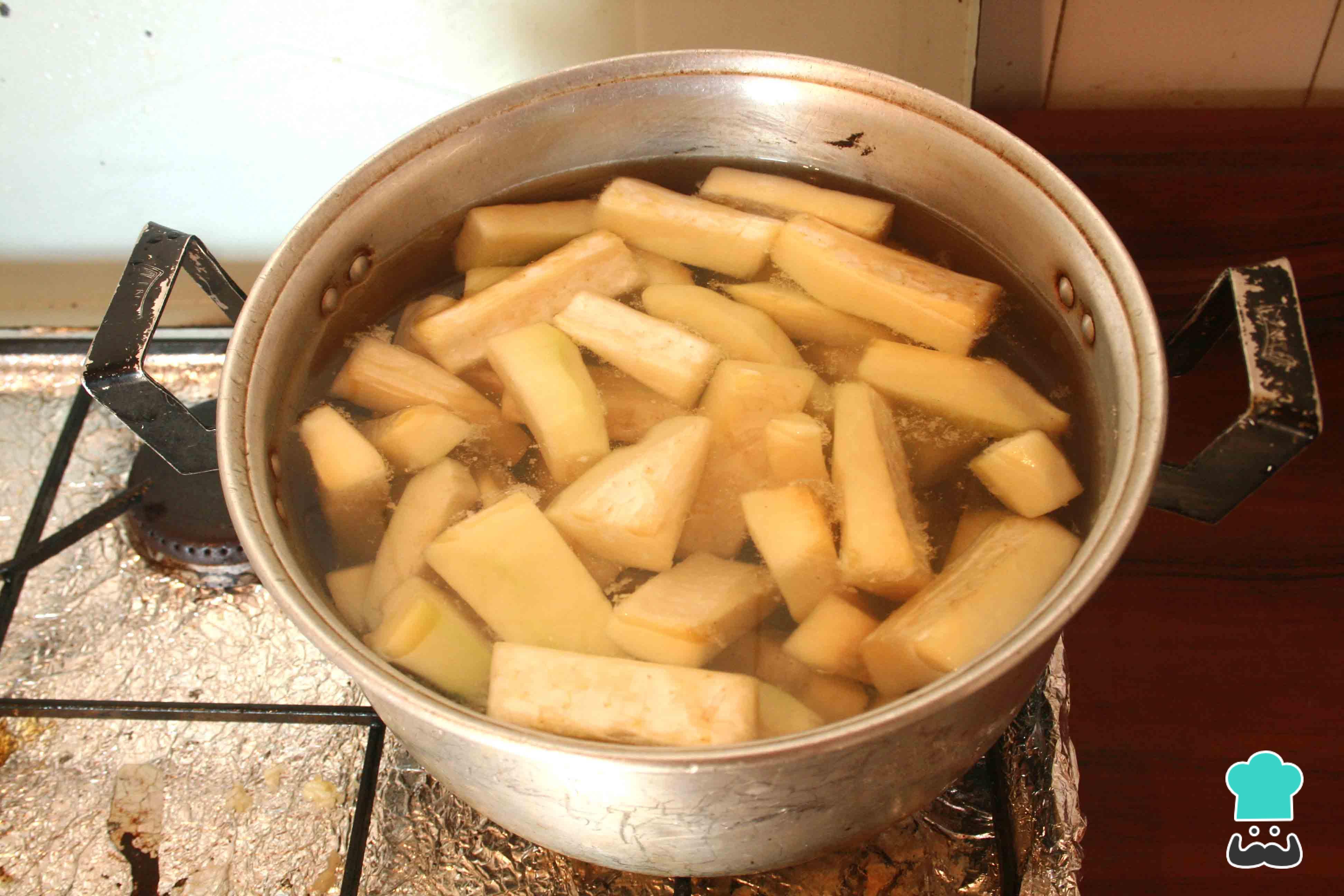 Luego, prepara una olla con agua y deposita los trozos de lechosa. El agua debe cubrir los trozos por completo. Agrega 1 cucharada de bicarbonato. Cuando hierva el líquido, espera 2 minutos más con la olla tapada antes de retirar del fuego.