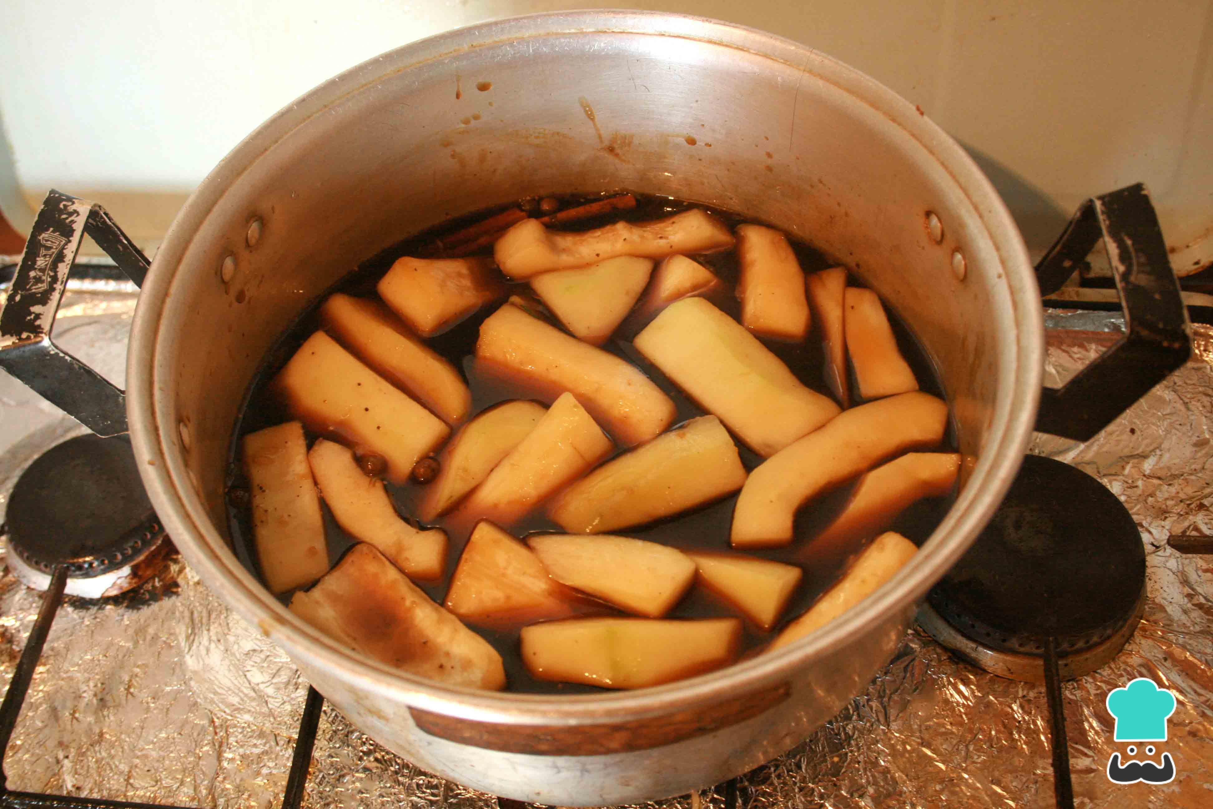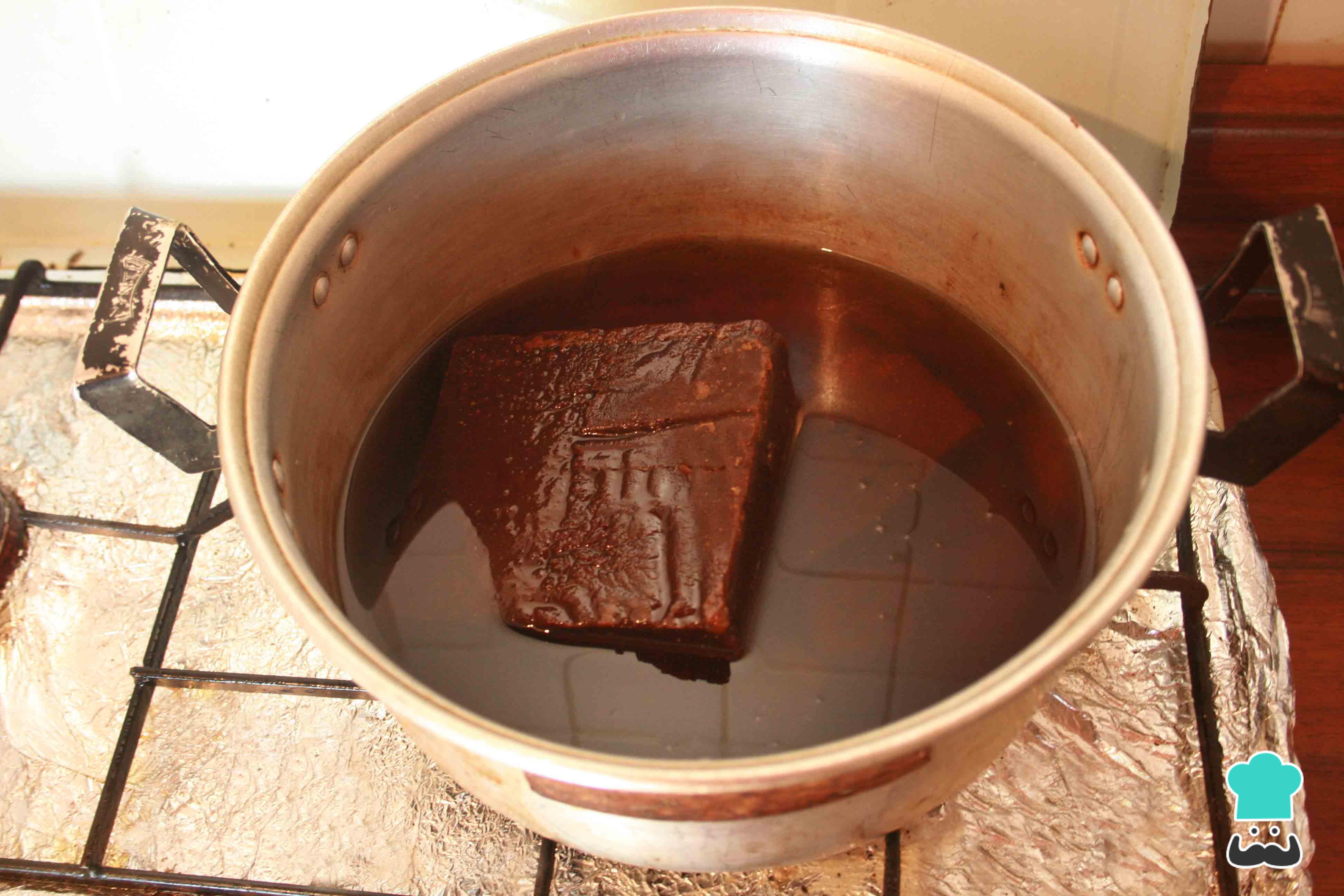 En una olla con unas 12 tazas de agua pon a derretir el papelón.