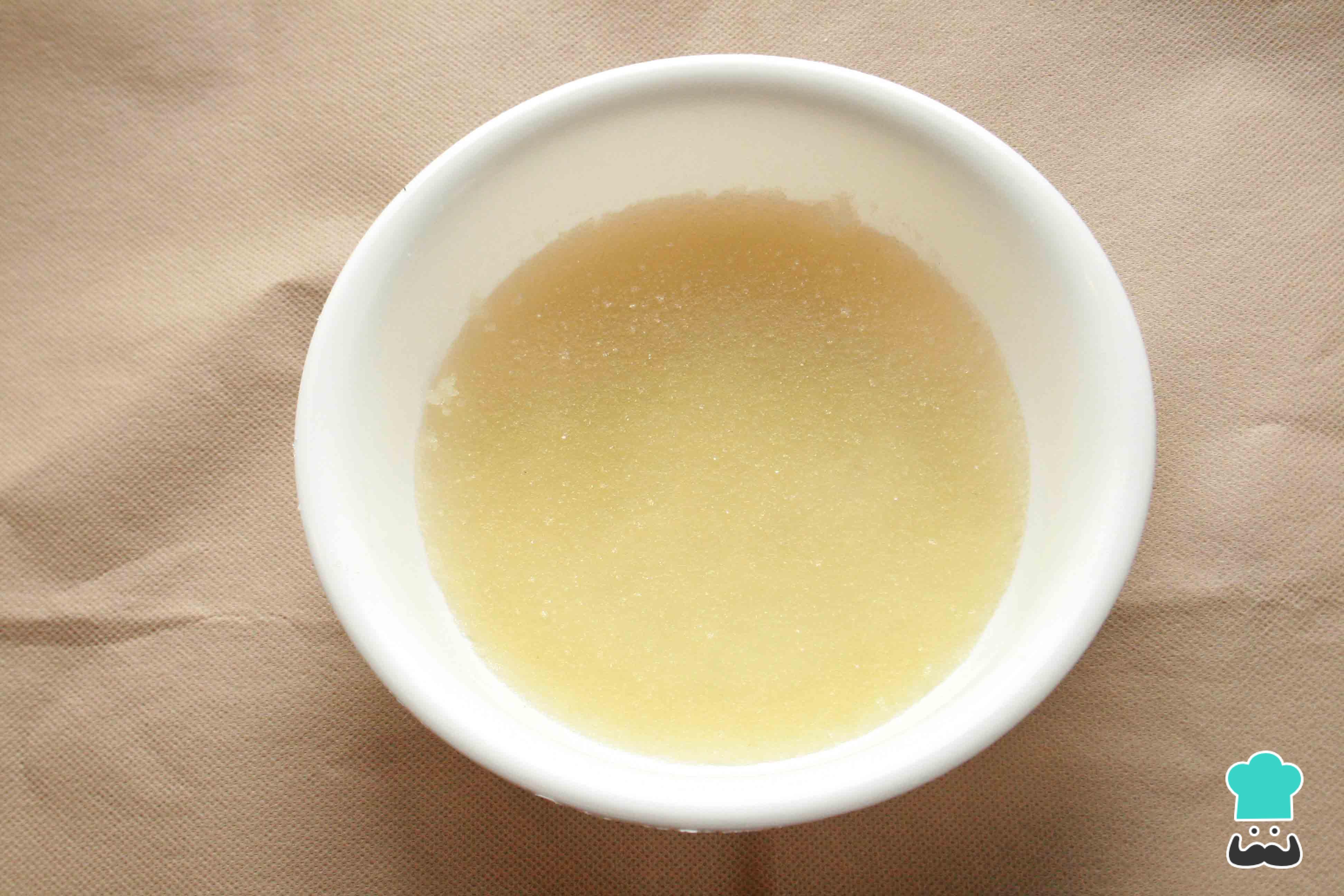 Diluye la gelatina sin sabor (2 sobres o 20 gramos) en 100 mililitros de agua. Remueve muy bien hasta disolverla por completo. Ten presente que cuanto más tiempo dejes la gelatina neutra reposando, mejor se hidratará; el mínimo es 4 o 5 minutos. Al final la gelatina será semejante a un trozo de gel. Reserva.