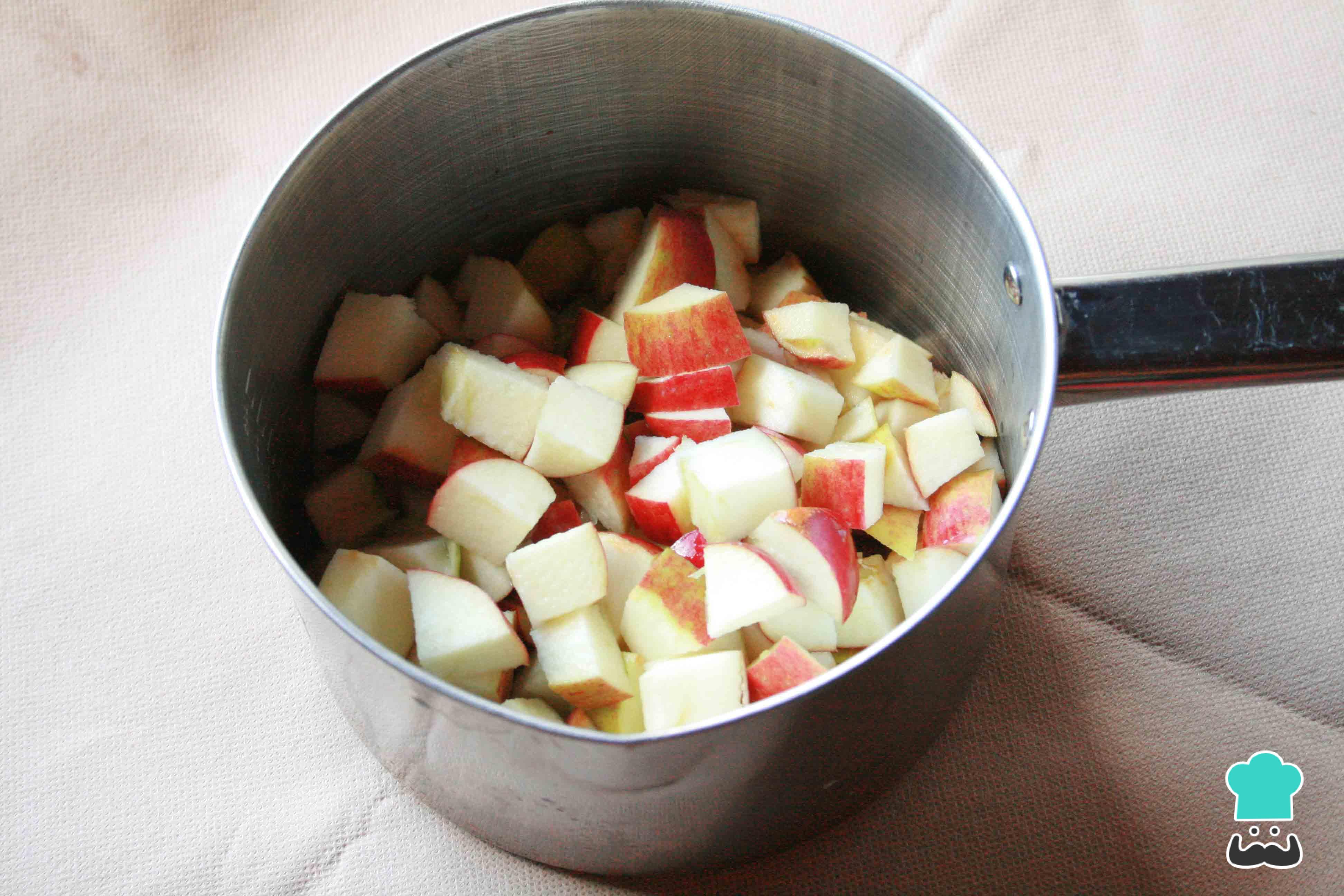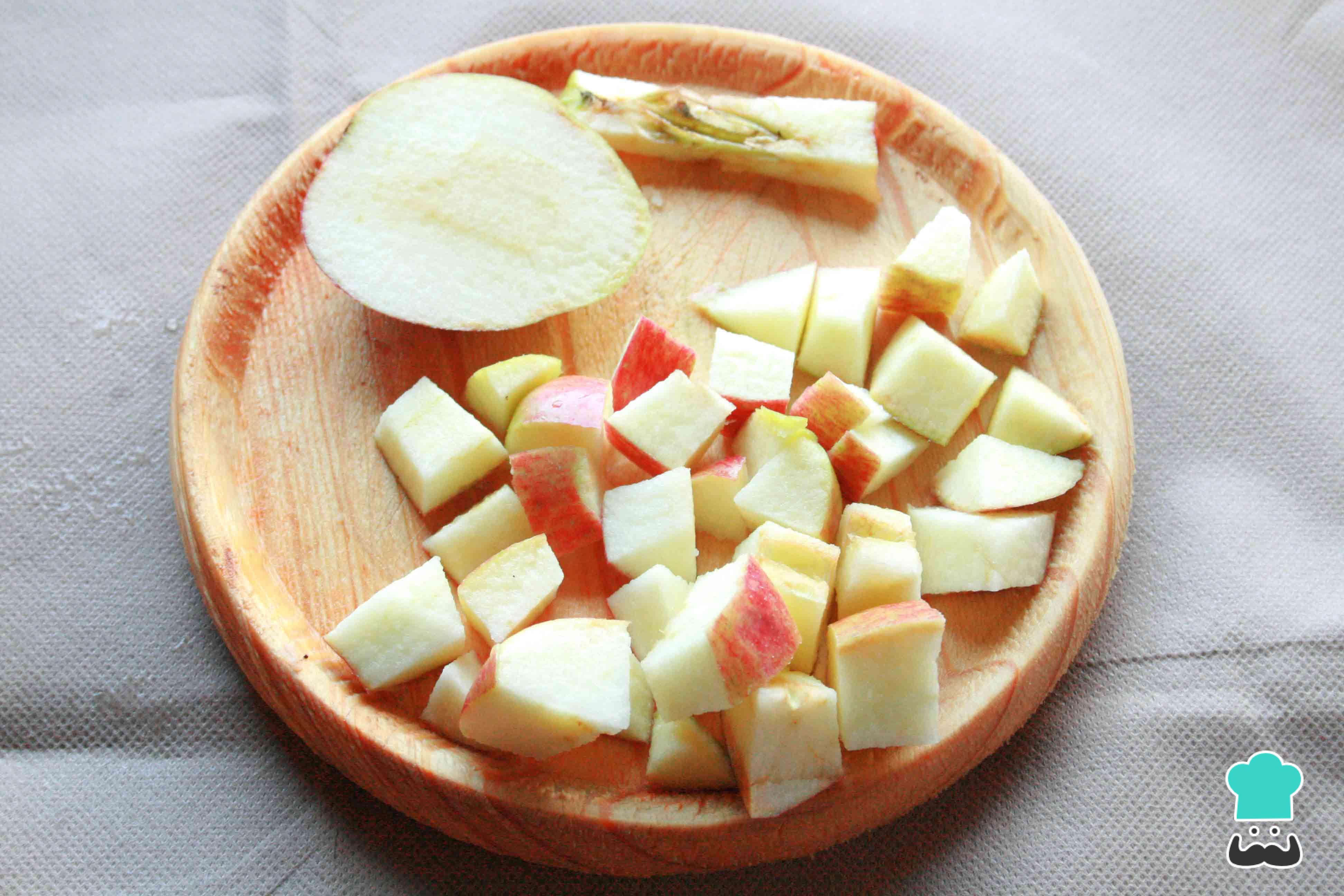 Lava y seca las manzanas. Corta el centro, elimina el corazón, las pepitas y el vástago. Pica en cubitos la fruta.