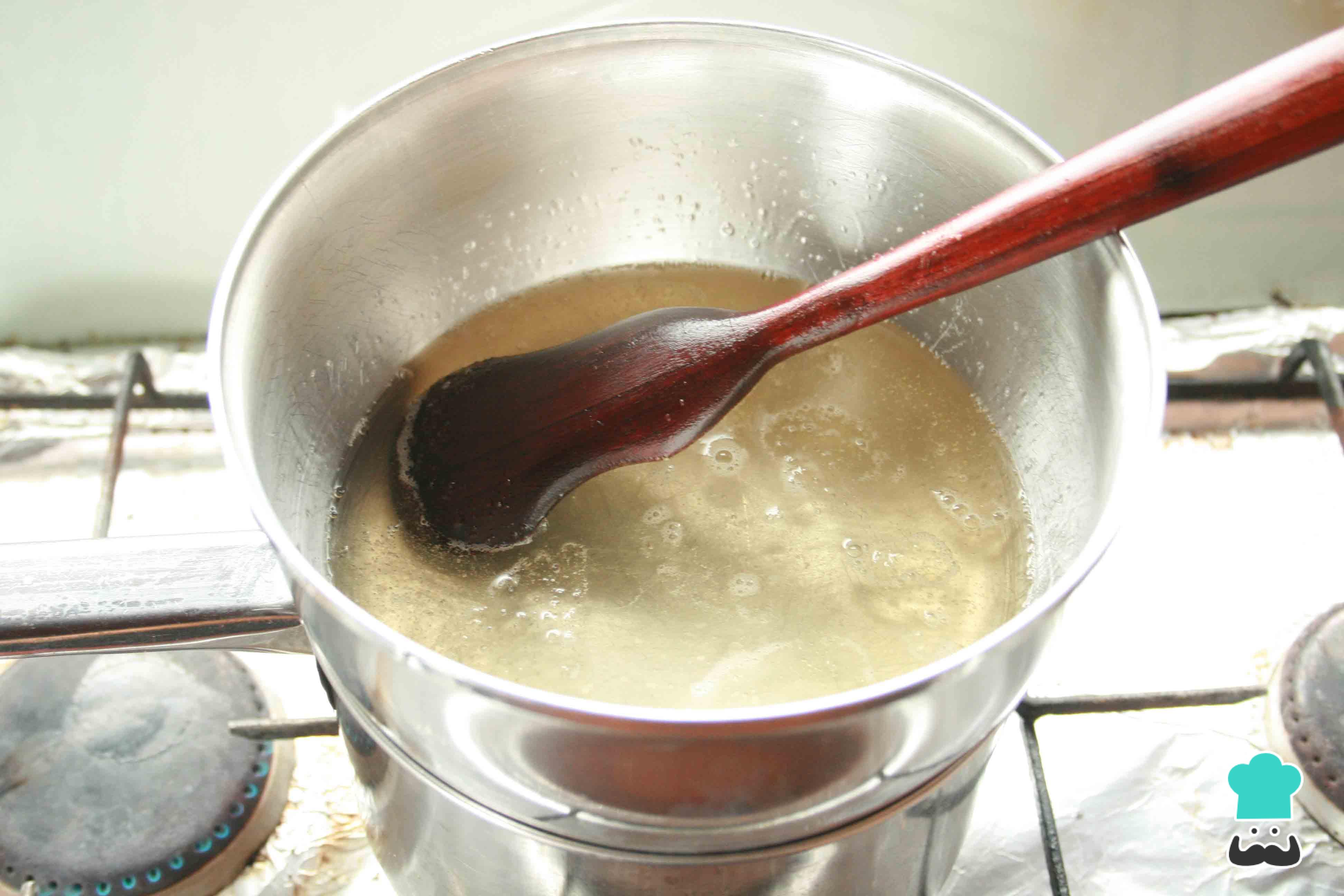 Cocina al baño María para culminar el proceso de hidratación de la gelatina sin sabor. Diluye la gelatina solida, removiendo con una cuchara de madera para facilitar el proceso. El baño María es ideal para controlar el calor en la gelatina, ya que si hierve pierde sus propiedades de gelificacion.