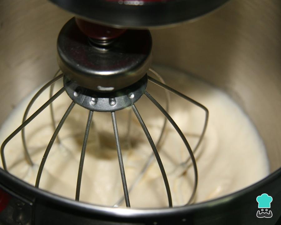 Ahora, incorpora la esencia de vainilla y la leche fresca y sigue batiendo hasta que al levantar la batidora o varillas eléctricas se formen picos en la masa. Precalienta el horno a 170ºC.