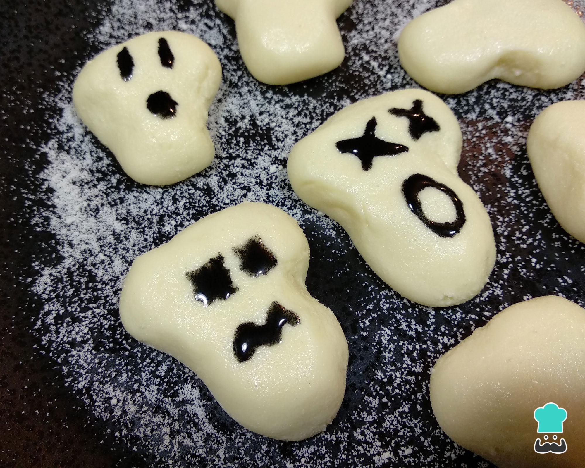 Truco: Contornea las caras de las calaveras con un palillo de dientes seco, de modo que el colorante se deposite en estos contornos y no gotee. Es mejor usar colorantes alimentarios en gel.