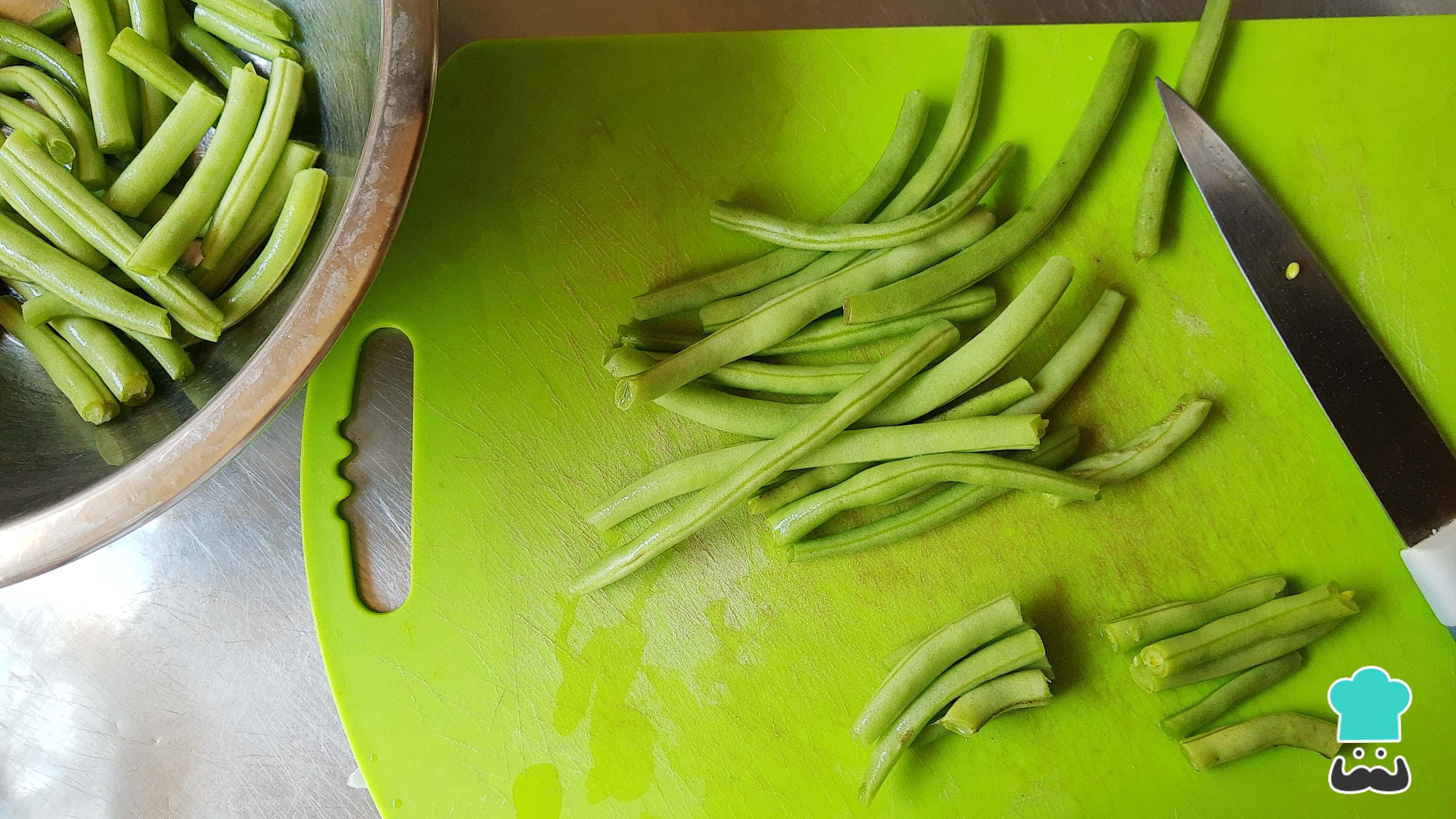 Para empezar la receta de ejotes con pollo, debes limpiar los ejotes extrayendo los extremos de la vaina. Destacamos que es muy fácil de quitar con las manos, también puedes hacerlo con un cuchillo. Luego corta por la mitad o en tres partes y reserva.