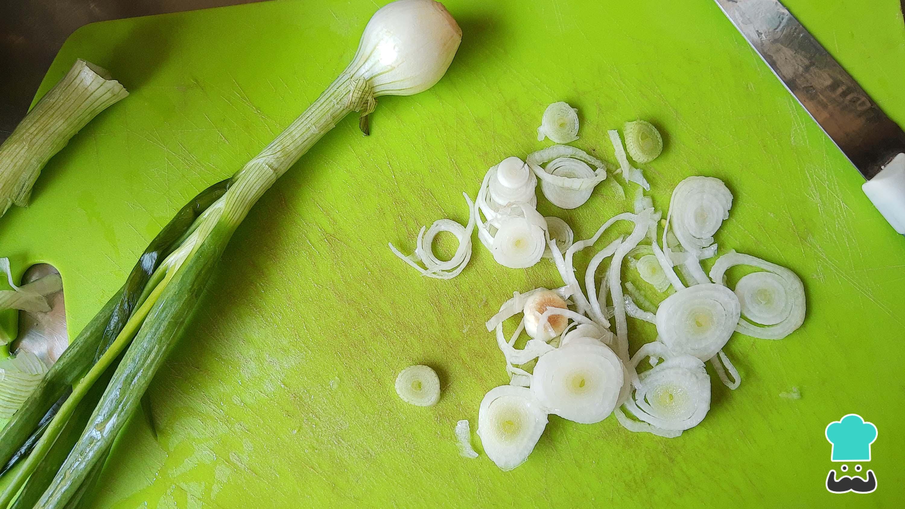 Lava la cebolla cambray y corta en rodajas finas la parte blanca. Puedes sustituir esta cebolla por cebolla blanca normal o cebolla morada.