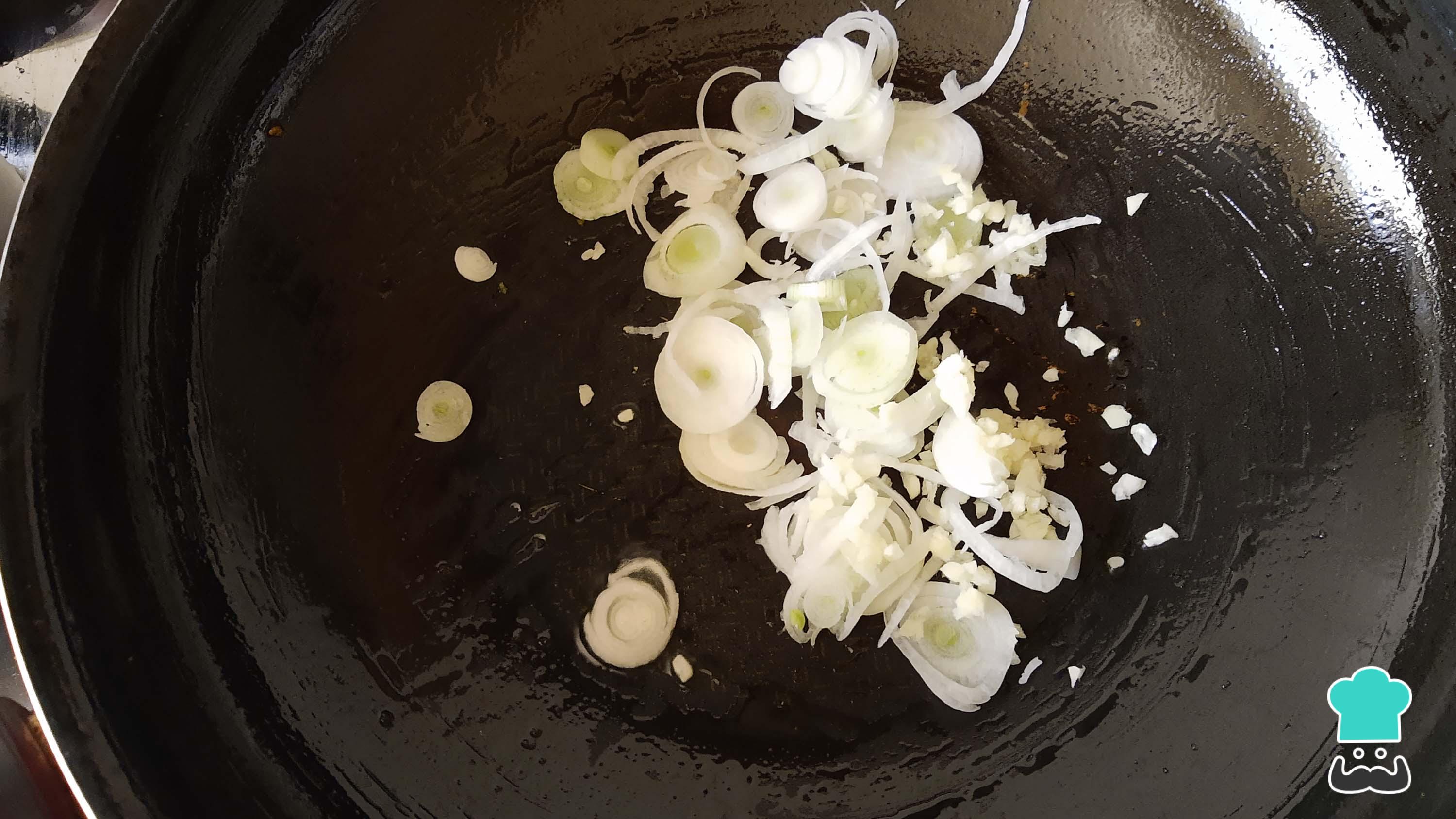 En un sartén con un poco de aceite, fríe la cebolla cambray en rodajas y el ajo finamente picado. Mueve constantemente hasta que notes que la cebolla comienza a dorarse.