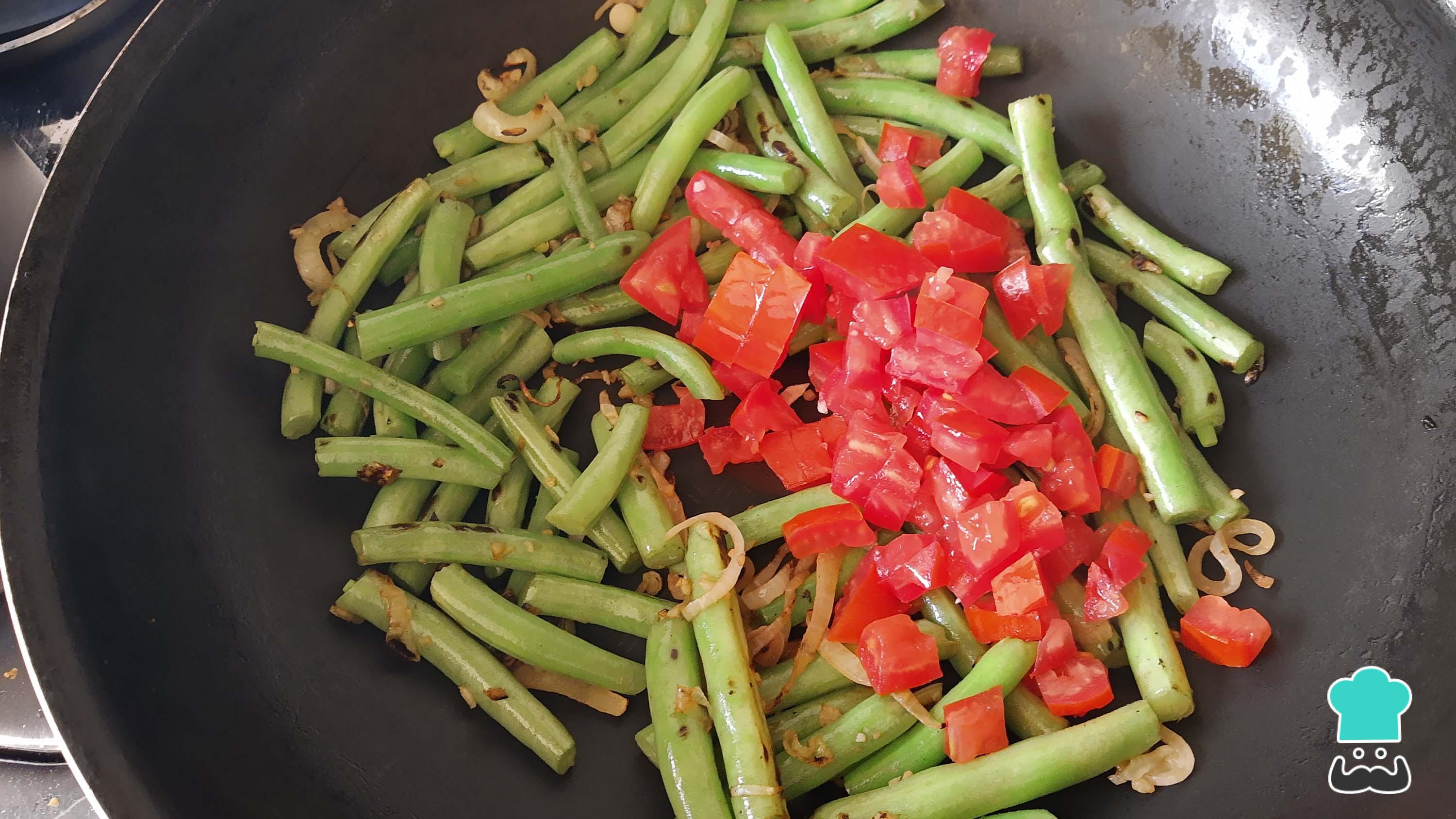 Enseguida agrega el ejote. Cocina aproximadamente 10 minutos o hasta que tome un color verde brillante y luego agrega el jitomate. Mezcla todo muy bien y cocina por 3 minutos más.