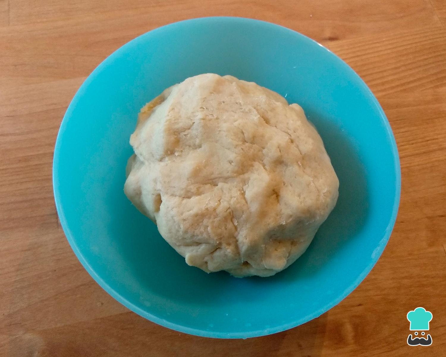 Empezamos la receta de empanada de bacalao por prepara la masa quebrada. Para ello, mezclamos en un bol la harina con la mantequilla, el agua y la sal. Amasamos con las manos hasta obtener una masa consistente, formamos una bola, la envolvemos con papel film y la dejamos reposar en la nevera durante 20 minutos. Para hacer una versión sin gluten, no te pierdas la receta de masa quebrada sin gluten.