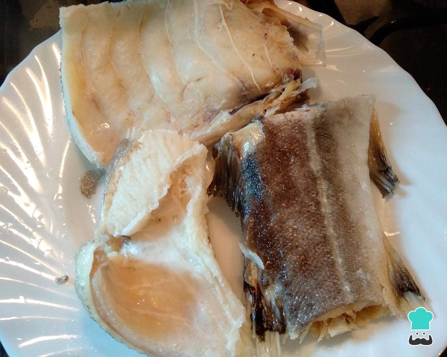 Mientras reposa la masa de la empanada de bacalao, cocinamos el pescado en agua con la hoja de laurel durante 15-20 minutos. Cuando esté listo, lo retiramos, colamos, dejamos que se enfríe y lo desmenuzamos quitando la piel y las espinas.