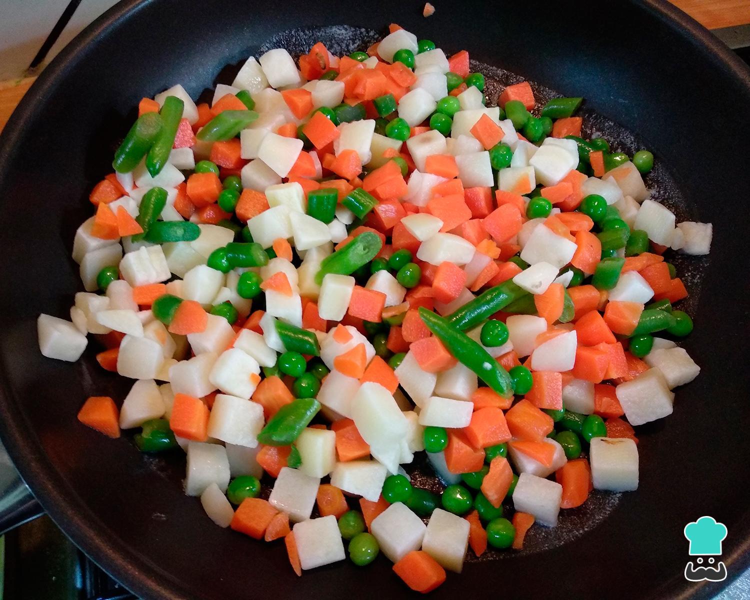 Al mismo tiempo que tenemos el bacalao cociéndose, ponemos una sartén al fuego con la mantequilla. Una vez fundida, agregamos las verduras picadas, sazonamos con sal y pimienta, revolvemos y tapamos. Cocinamos las verduras con mantequilla durante 5-10 minutos. Luego, retiramos la tapa y cocinamos un minuto más, revomiendo.
