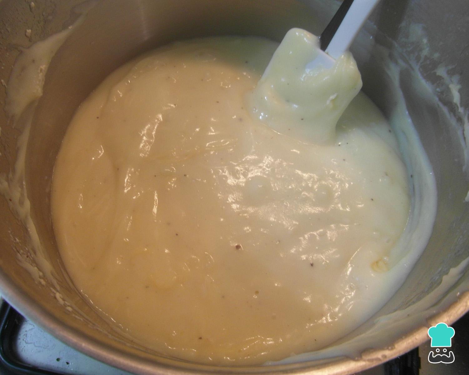 Para terminar de preparar el relleno de la empanada de bacalao con masa quebrada, elaboramos la salsa bechamel. Así, disolvemos la maicena en la leche y la colocamos en una sartén con la mantequilla. Removemos constantemente para que espese, durante 10 minutos, y sazonamos al gusto con nuez moscada, sal y pimienta.