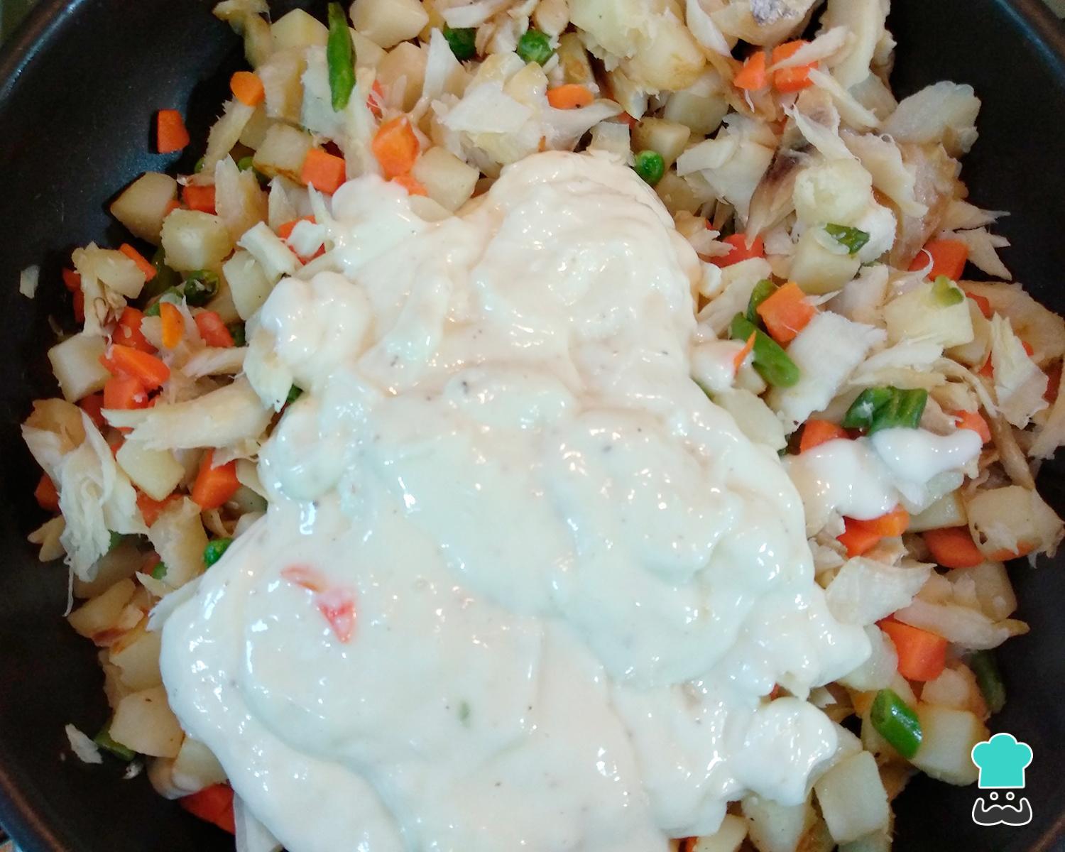 Ahora solo nos queda mezclar el bacalao desmenuzado con las verduras, el queso y la salsa bechamel. Mezclamos bien el relleno de la empanada, probamos y ajustamos el sabor con sal y pimienta si es necesario.