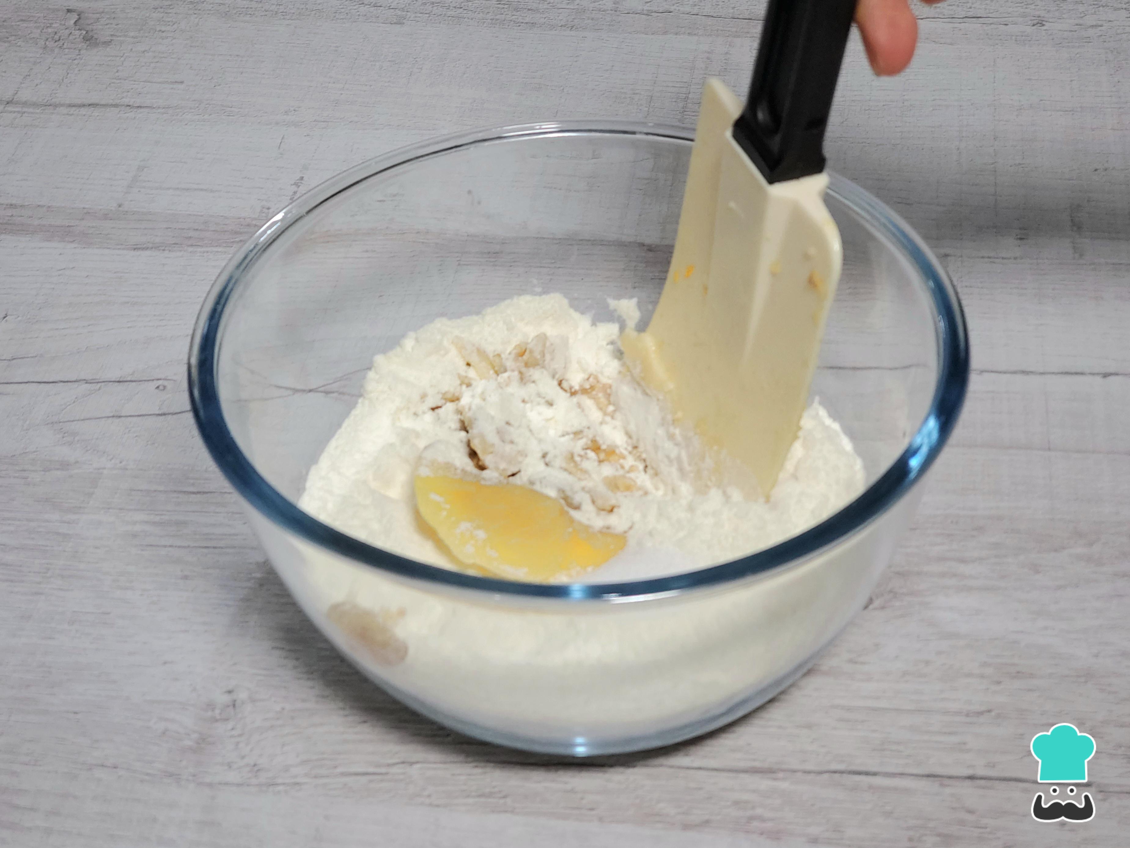 Comienza colocando la harina en un bowl amplio junto con la sal. Añade la grasa vacuna y desmenuza un poco mezclando con la harina para que se integre mejor.