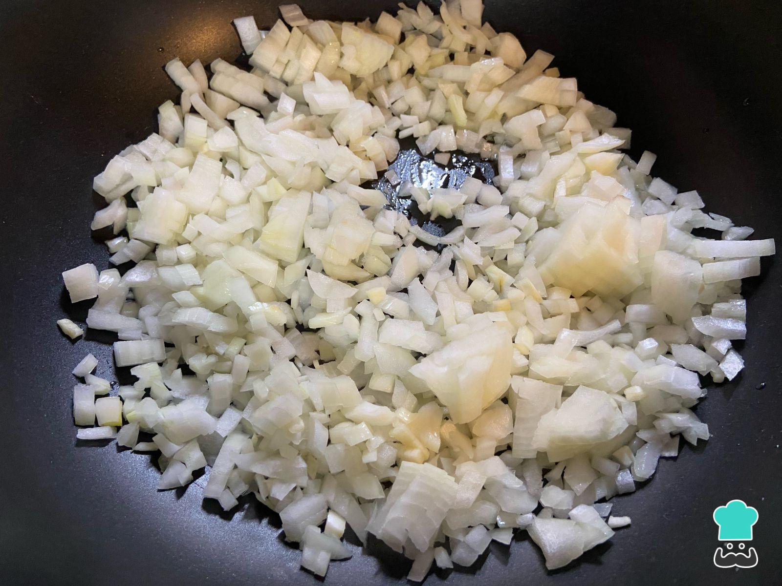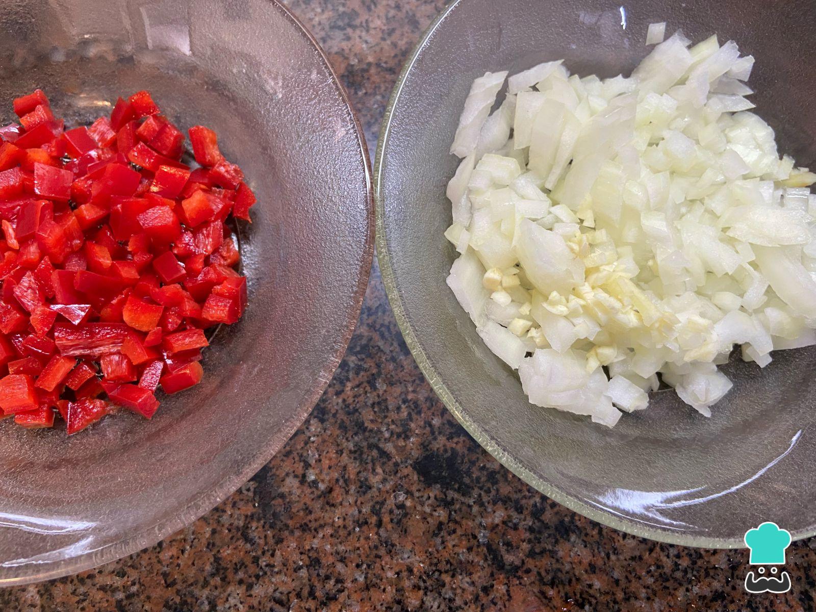 Para comenzar con esta preparación, pela y pica la cebolla y el ajo. También lava retira las nervaduras y corta en pequeños cubos el pimiento.