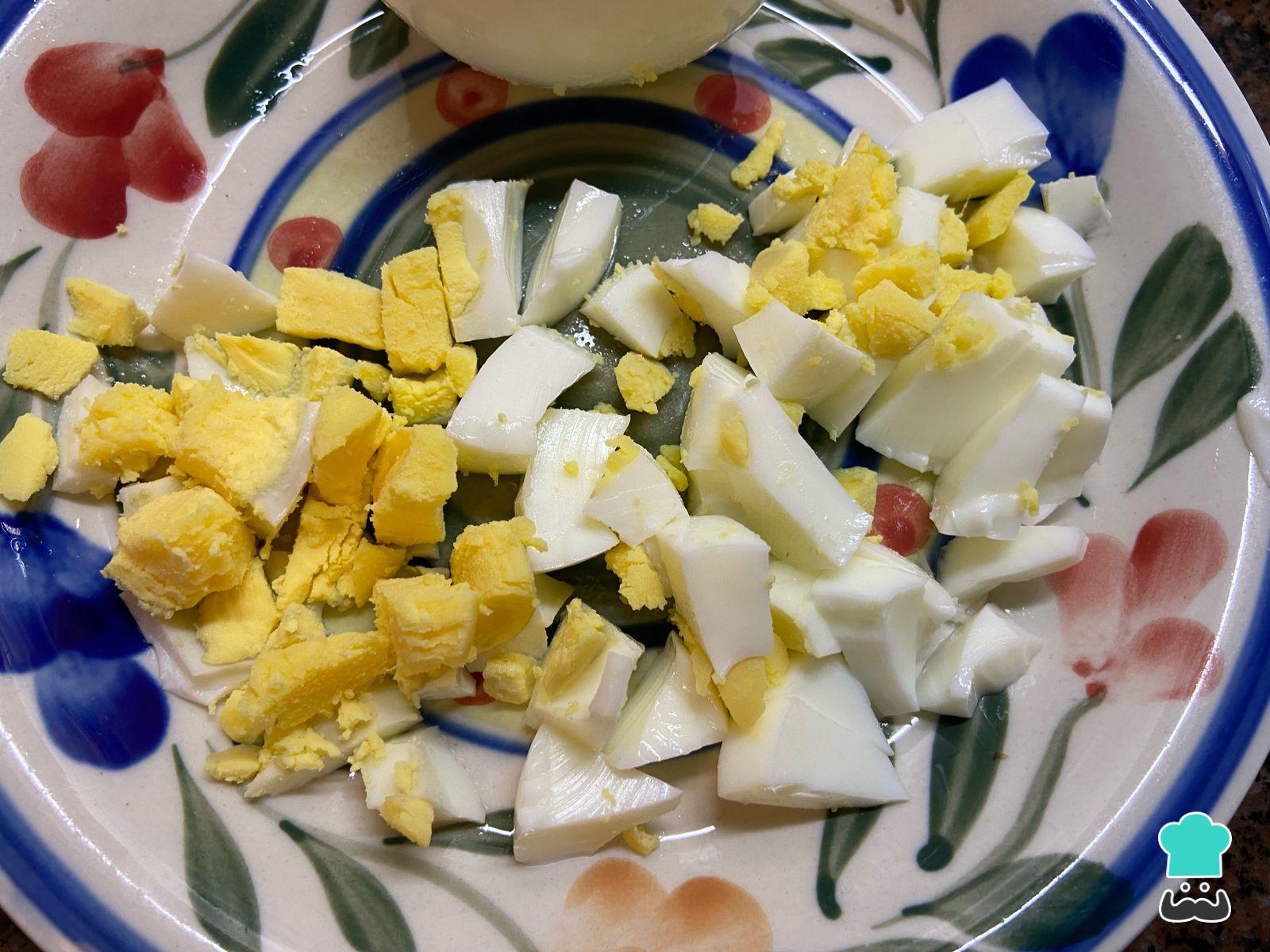 Pela y pica el huevo duro, retira los carozos de las aceitunas y córtalas en rodajas. Si decides usar pasas de uva debes ponerlas en agua tibia para hidratarlas.