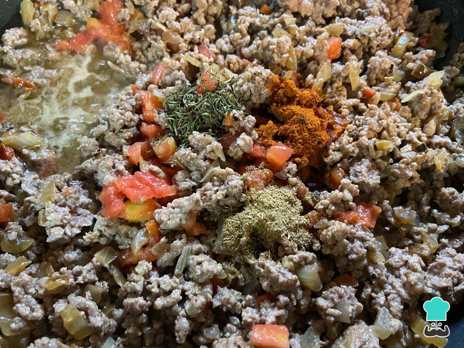 Cuando la carne esté cocida, pero no seca, agrega el tomate triturado y condimenta con sal, pimienta, pimentón dulce, comino y tomillo. Mezcla y apaga el fuego.