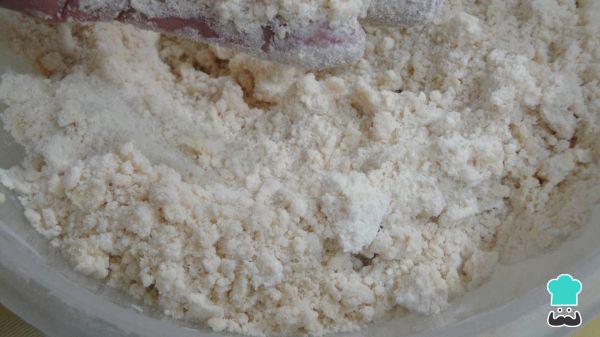 Mezclar la harina con la manteca, el azúcar y la sal con las manos, como frotando suavemente la mantequilla con el resto de ingredientes para crear una masa arenada, y una vez que tenga esa forma, agregar el aceite, la levadura y el agua o la leche.