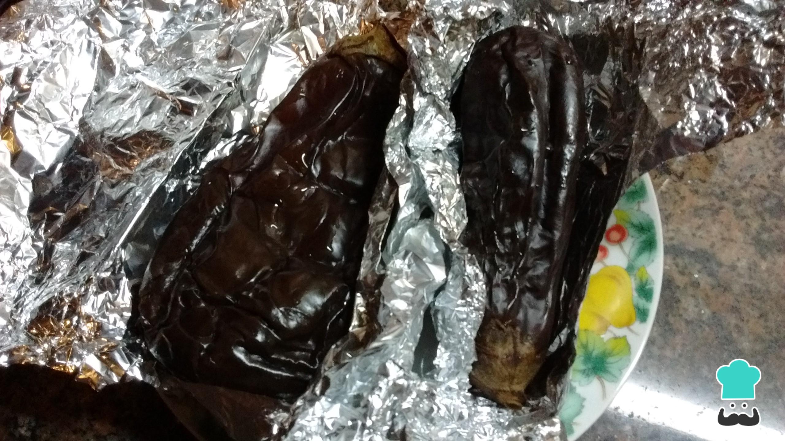 El primer paso de esta preparación consiste en la cocción de los vegetales. Para ello, vamos a lavar las berenjenas y envolverlas enteras con papel aluminio. Cocínalas en el horno fuerte (200-220ºC) por unos 40-60 minutos hasta que al agarrarlas con una pinza, la misma se hunda