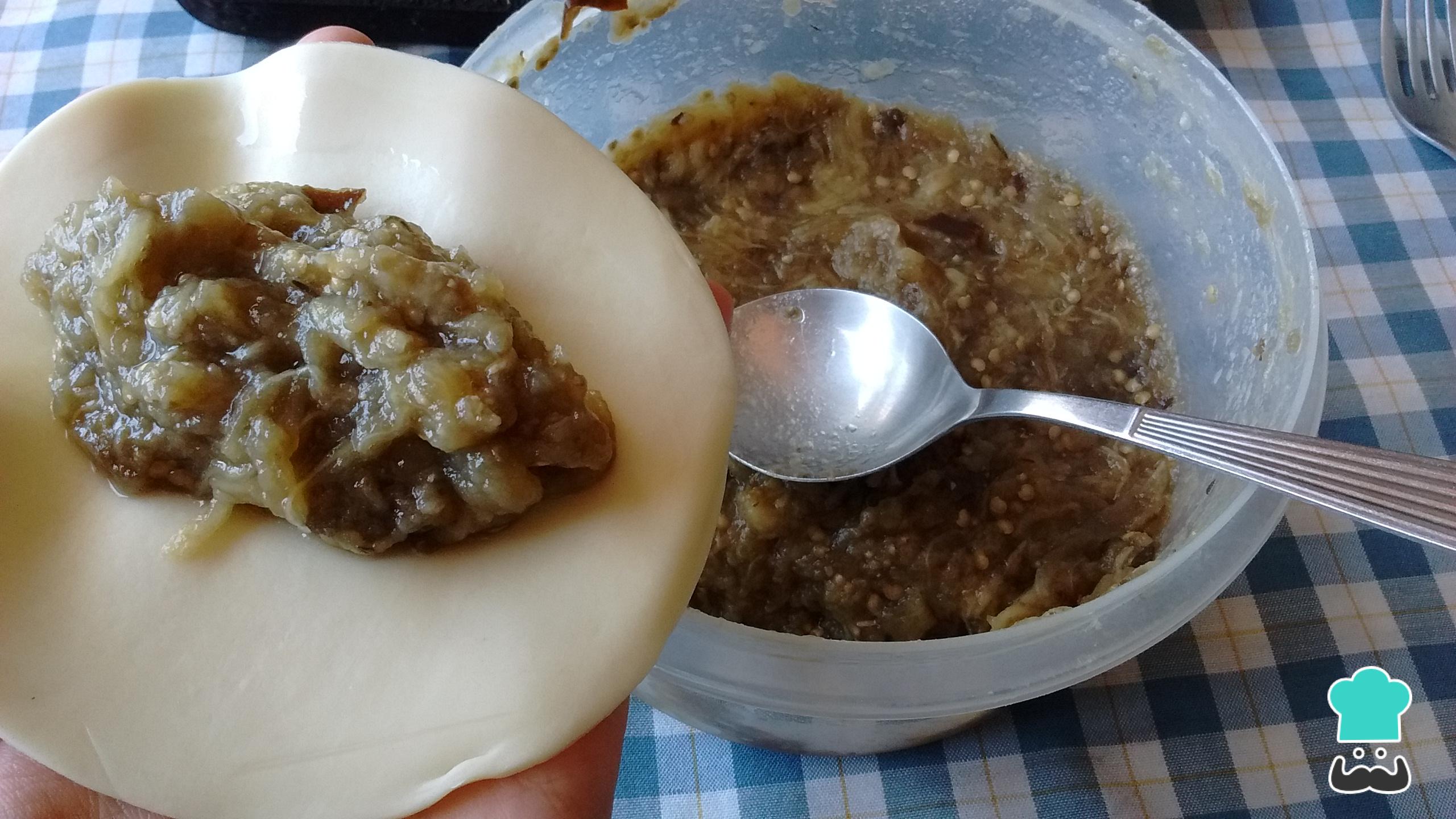 Comienza a rellenar tus empanadas, disponiendo una cucharada del puré de berenjenas en el centro del disco y humedeciendo la mitad del borde con ayuda de las yemas de los dedos. Ciérrala poco a poco, asegurándote que no quede aire dentro y que el relleno no toca los bordes, para que los mismos no se abran durante la cocción.