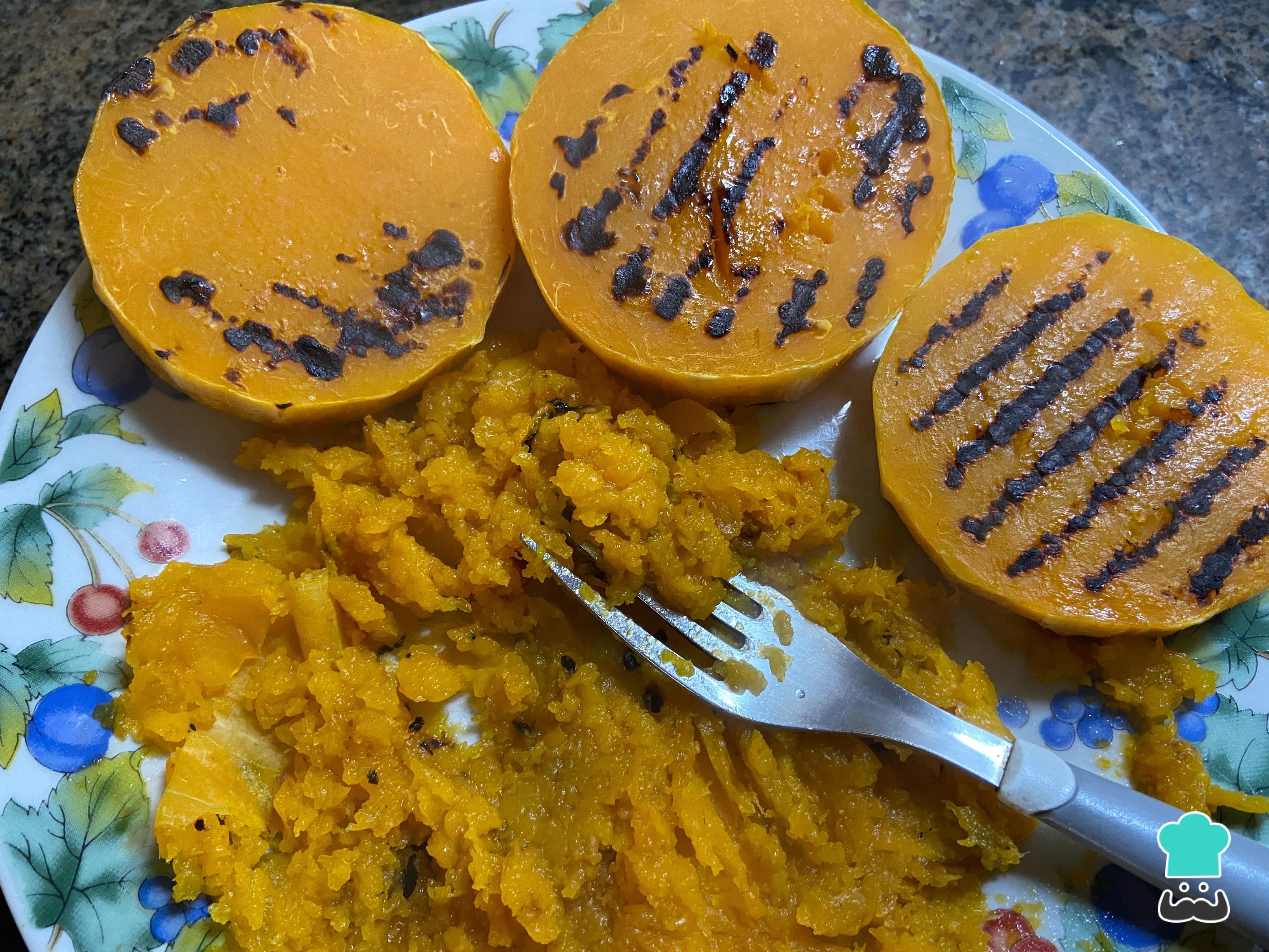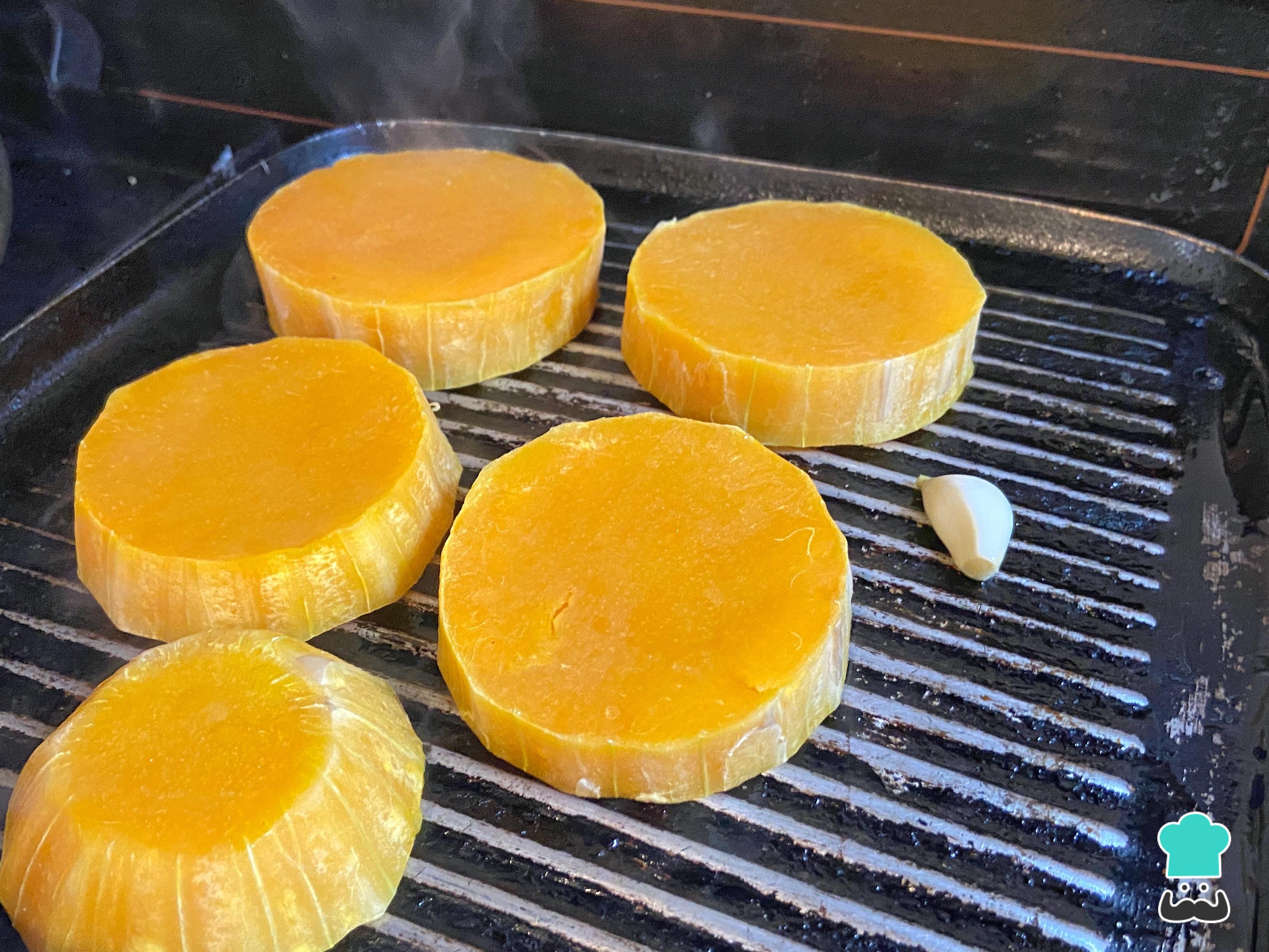 Pasado el tiempo, calienta una plancha con 1 cucharadita de aceite y 1 diente de ajo. Grilla por ambos lados las rodajas de calabaza.