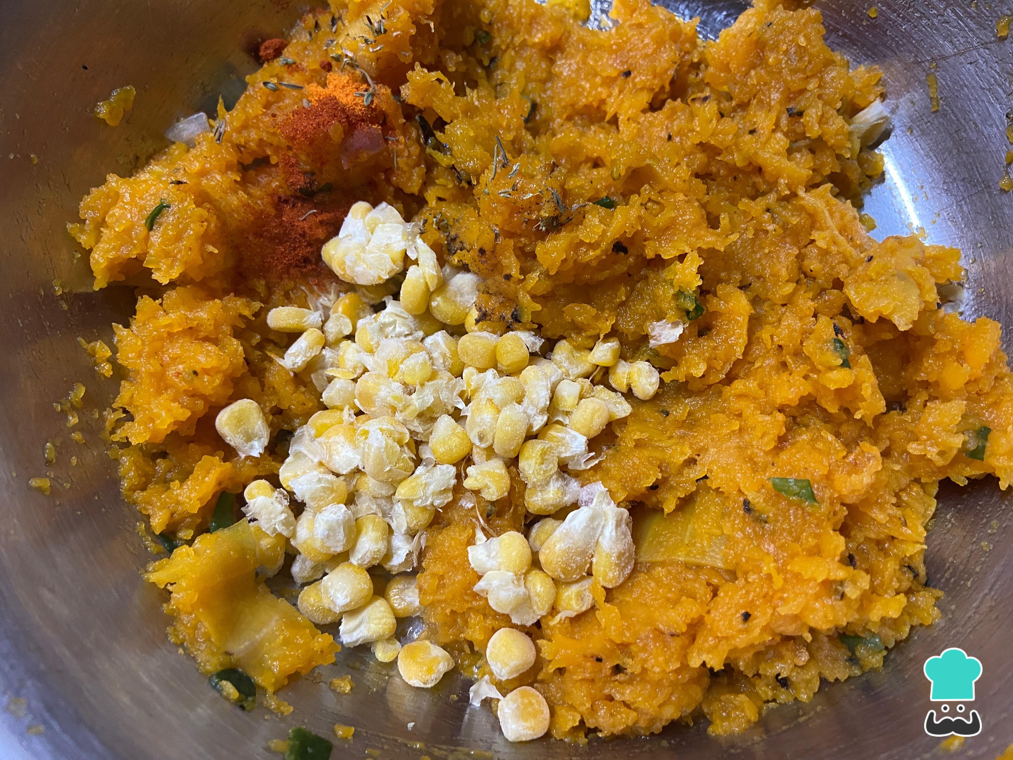 Mezcla el puré de calabaza con el choclo desgranado, el verdeo picado y los condimentos (nuez moscada, cúrcuma, pimentón y tomillo). Puedes utilizar choclo congelado, de lata o fresco, previamente cocido o hervido. En este caso, son unos 10 minutos en microondas o al vapor durante 4 minutos por unidad. Reserva tu relleno hasta que se enfríe.