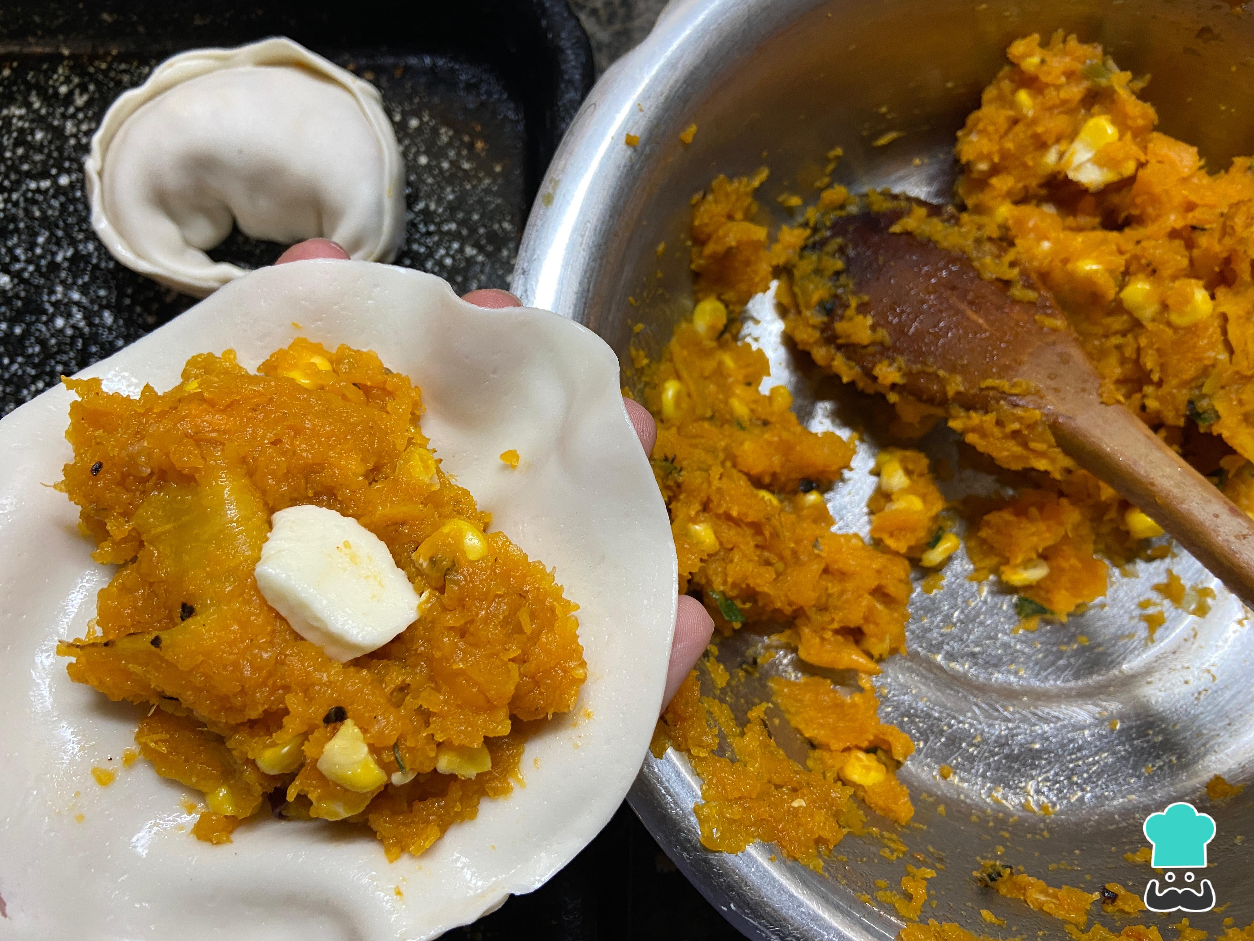 Cuando el relleno de tus empanadas de calabaza y choclo esté frío, rellena los discos y añade un cubito de queso fresco en el centro. Si no consumes productos de origen animal, evita el queso.