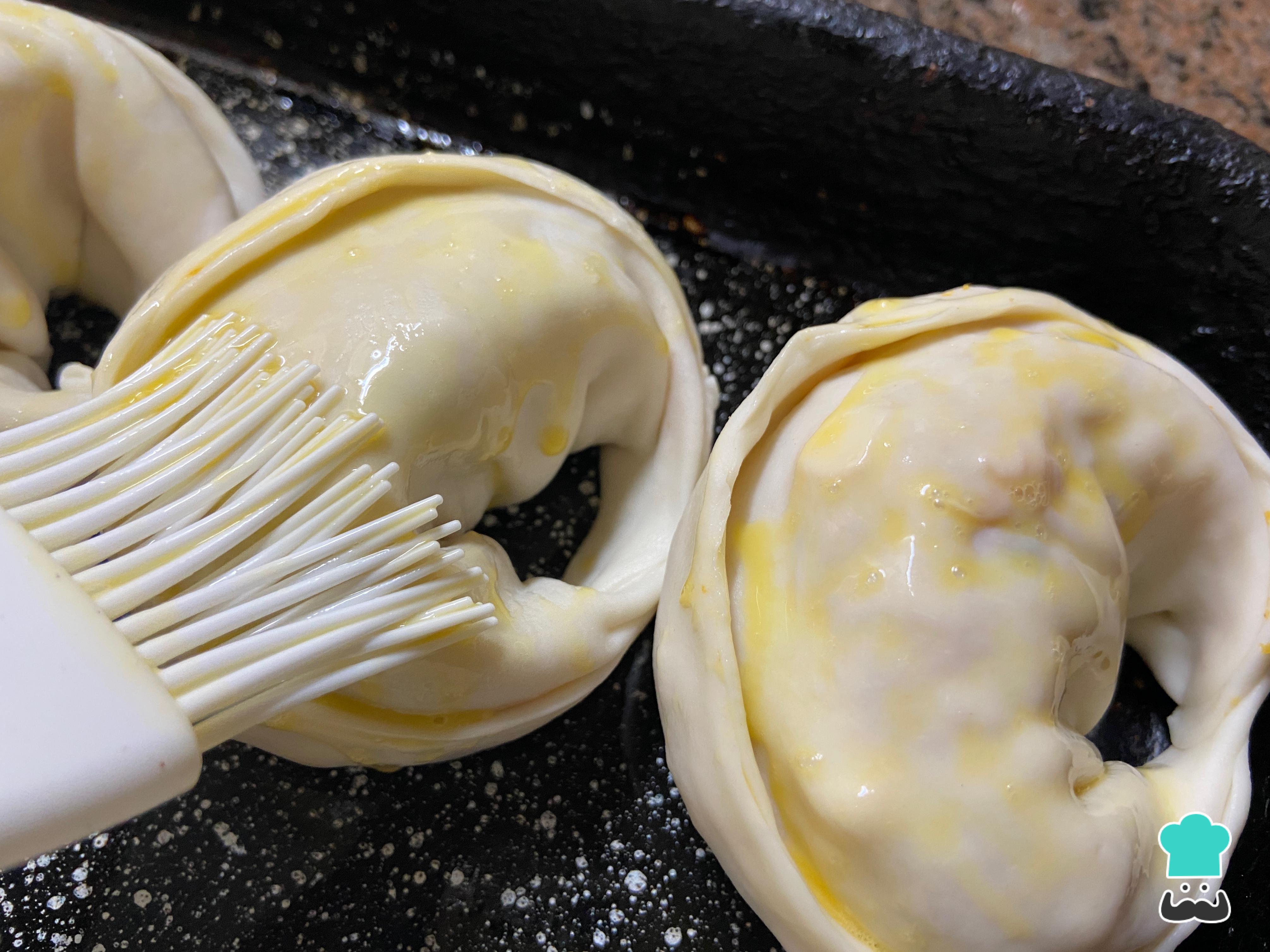 Ubica las empanadas sobre una asadera previamente engrasada y, a continuación, píntalas con el huevo batido. Si no consumes productos de origen animal, también puedes evitar este paso. Luego, cocina las empanadas en el horno precalentado a 200 ºC o 220 ºC durante 15 minutos o hasta que estén bien doradas.