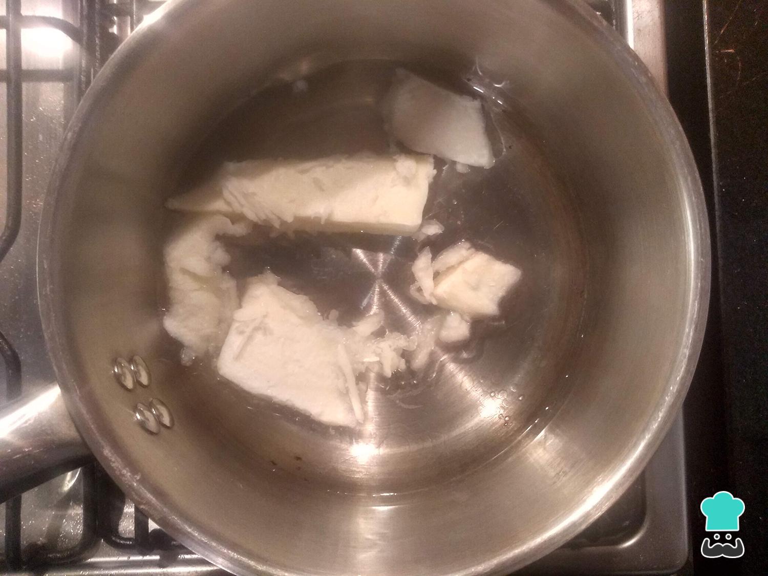 Primero, empieza a preparar la masa de las empandas. Para ello, pon a calentar el agua y la mitad de la grasa vacuna hasta que se disuelva. Una vez disuelta, deja que se enfríe.