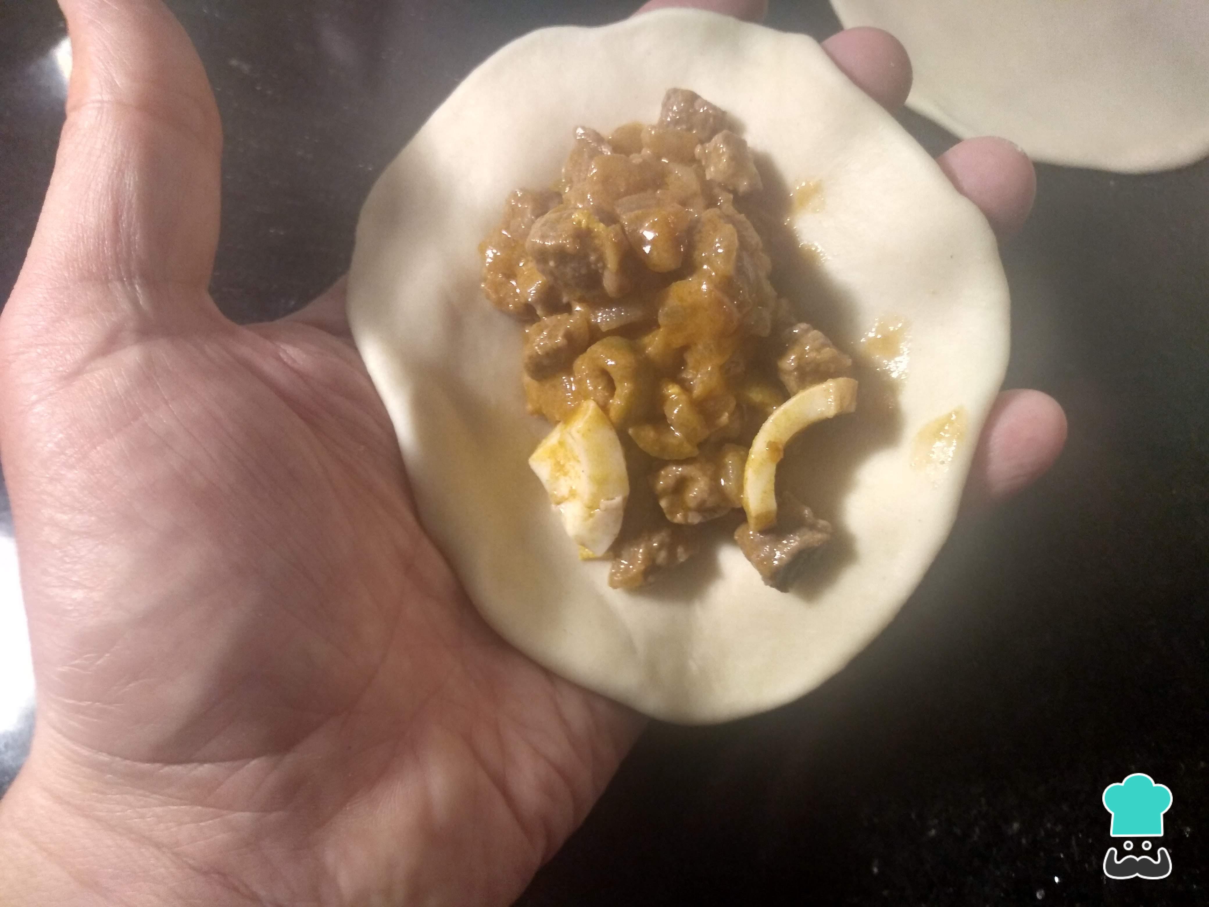 Para rellenar la empanadas, coge un círculo de masa con la mano y coloca un poco de relleno en el centro, aproximadamente unos 50-60 gramos por empanada.