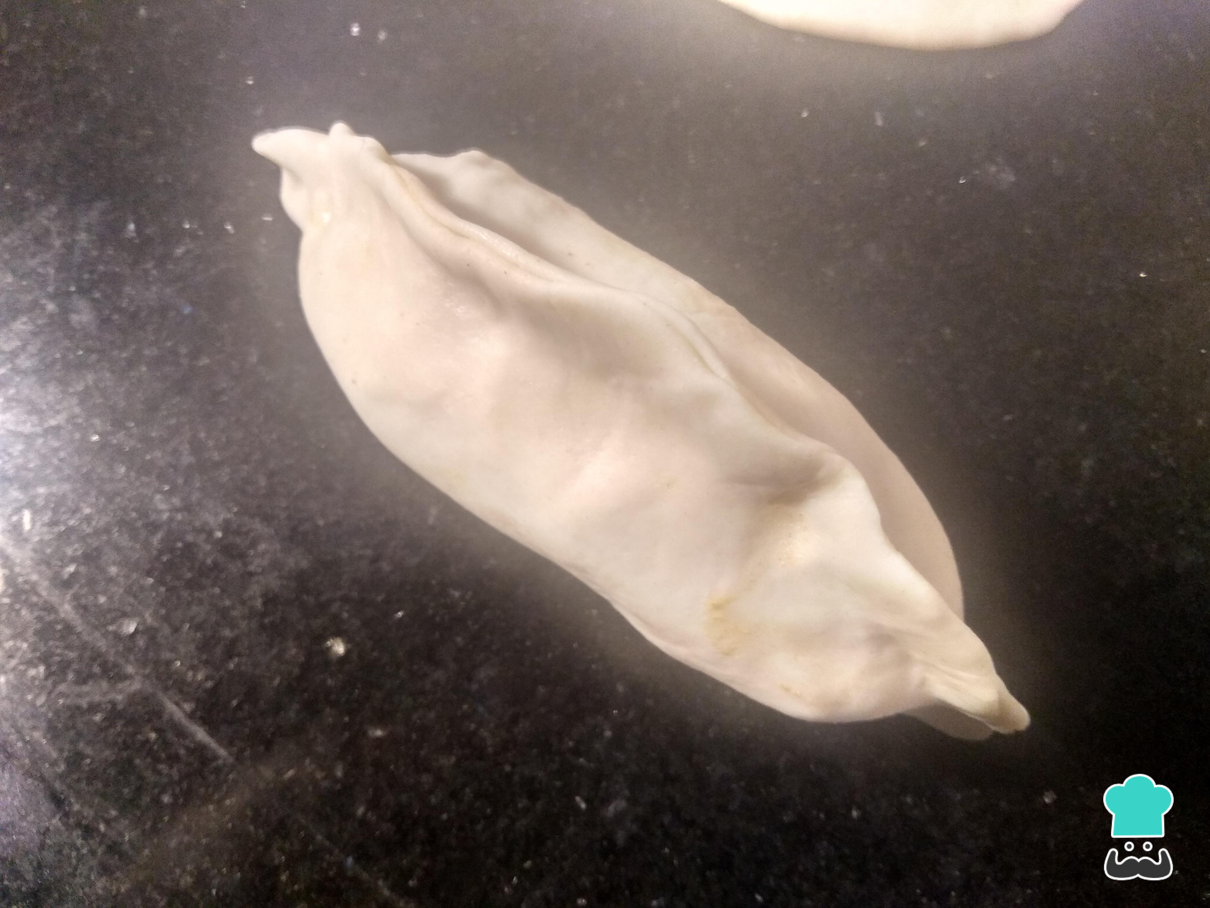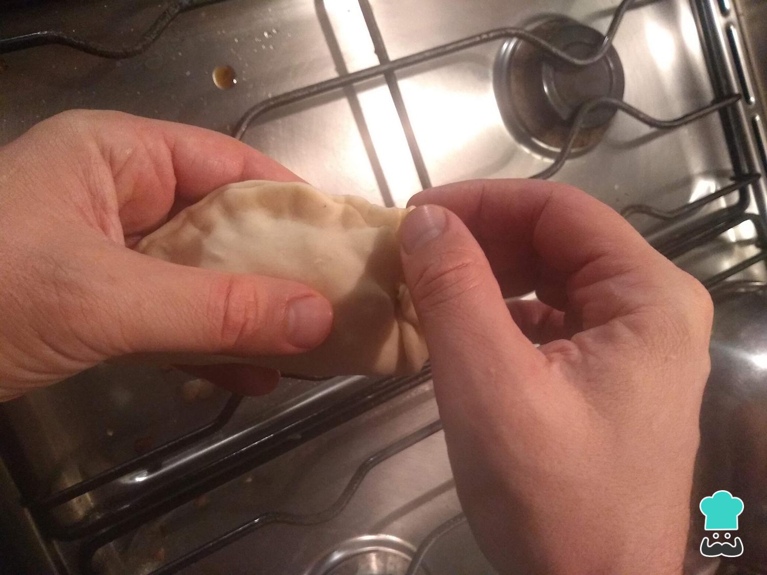 Pinta con agua los bordes de la mitad de la empanada y ciérrala ejerciendo un poco de presión entre las dos mitades para que quede bien sellada.