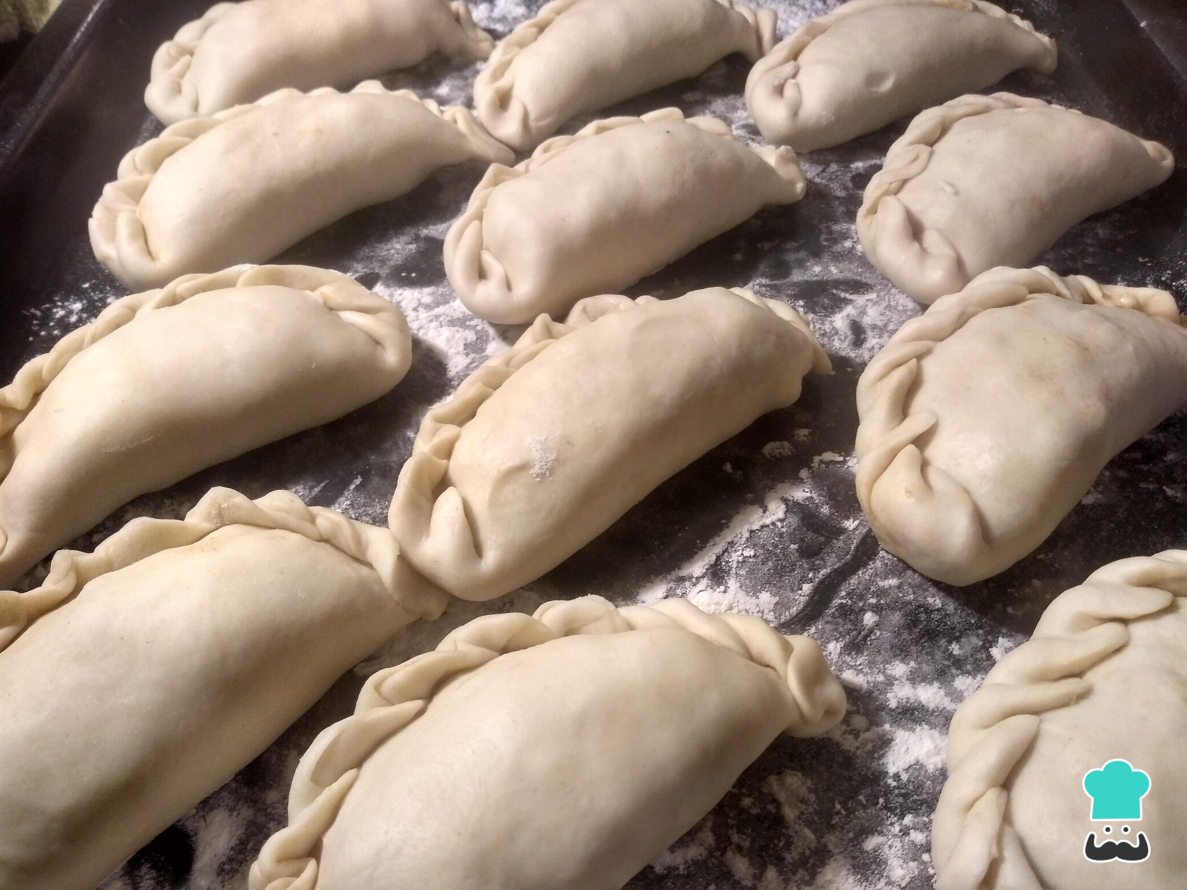 Cuando todas las empanadas estén hechas, colócalas sobre una bandeja para horno con un poco de harina espolvoreada. Luego, hornea las empanadas de carne hasta que la masa esté dorada, unos 10-15 minutos.