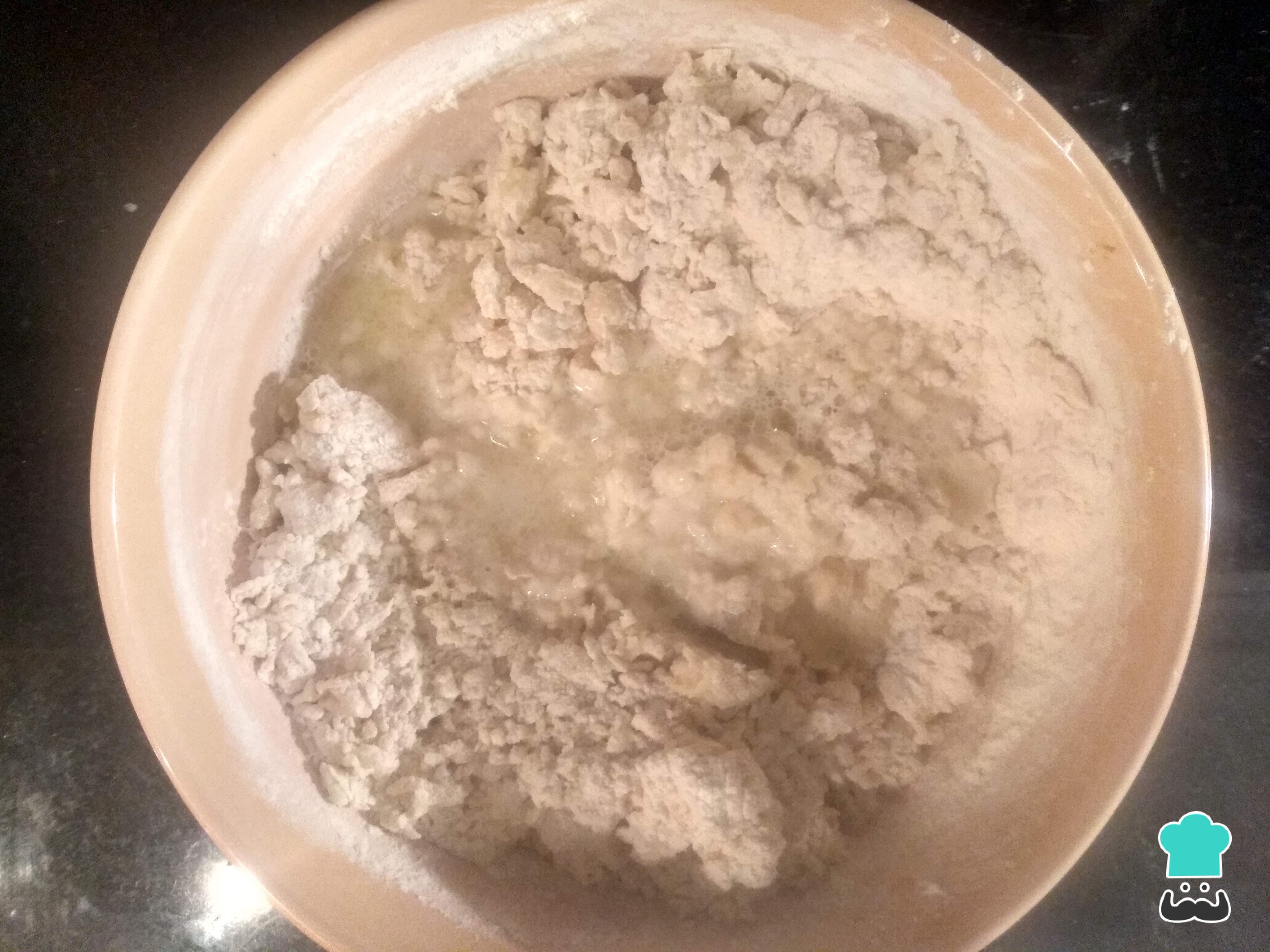 Coloca la harina en un bol con un pizca de sal y vierte el agua con la grasa disuelta.