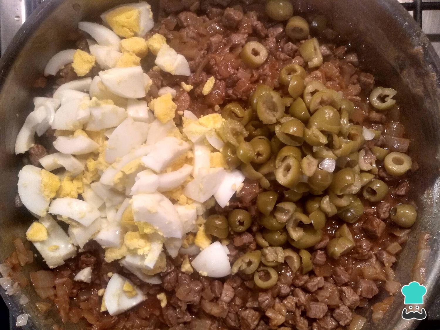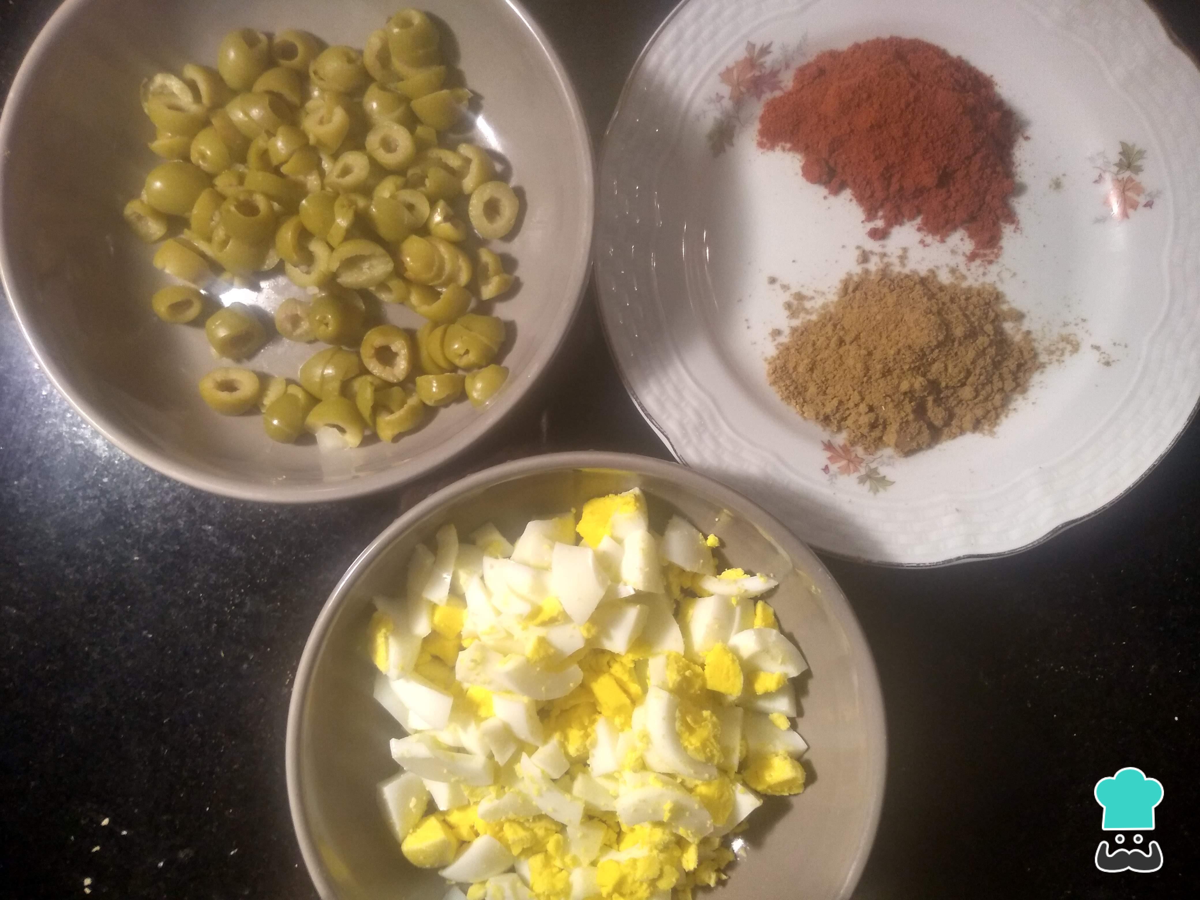 Cuando estén listos, pasa los huevos por agua fría para cortar la cocción y poder pelarlos sin quemarte. Pica los huevos y las aceitunas y prepara todos los condimentos que usarás para el relleno. Recuerda que puedes modificar estos ingredientes a tu gusto, ya que el secreto de unas buenas empanadas jugosas está en la cocción de la carne, como veremos.
