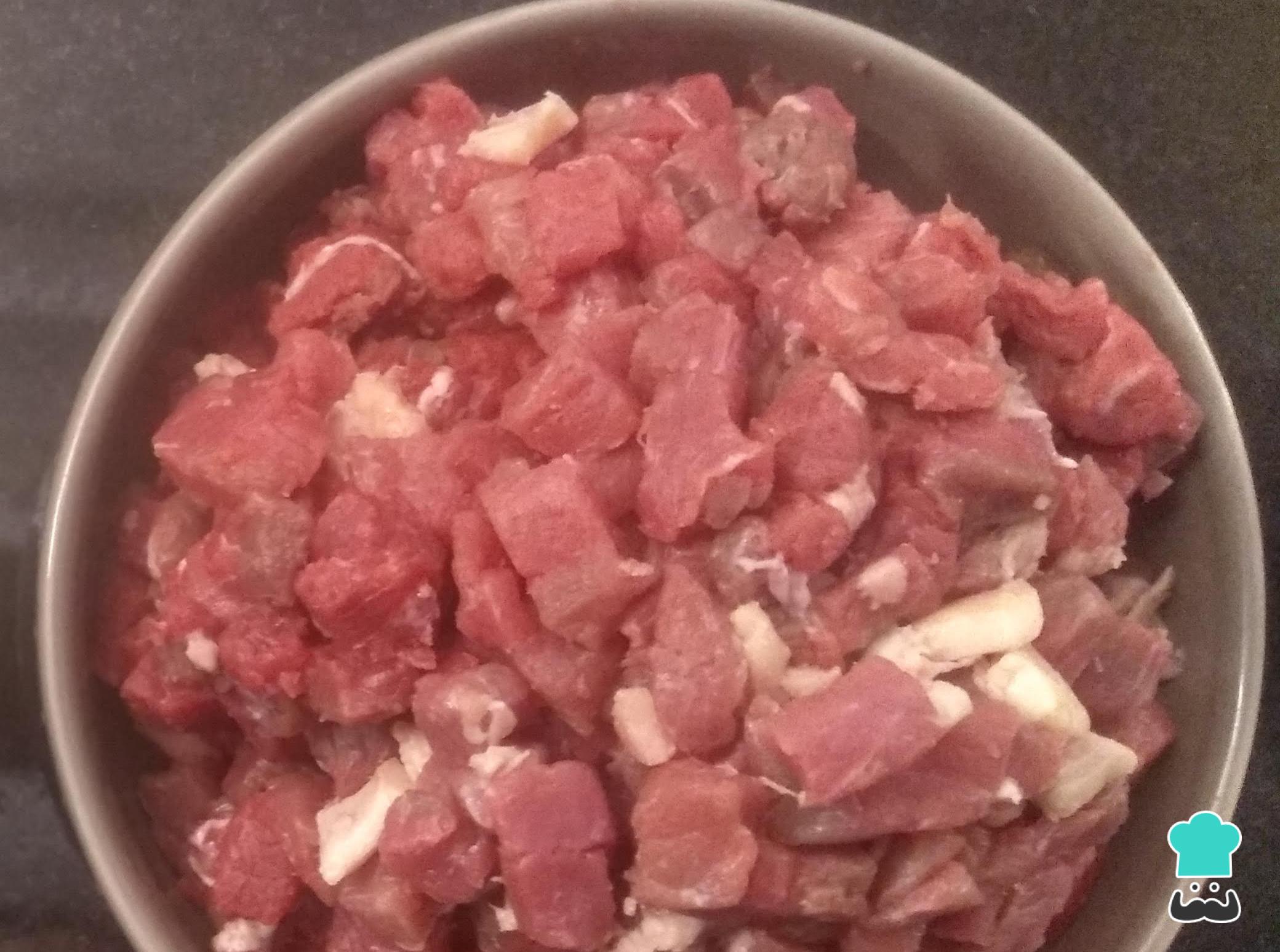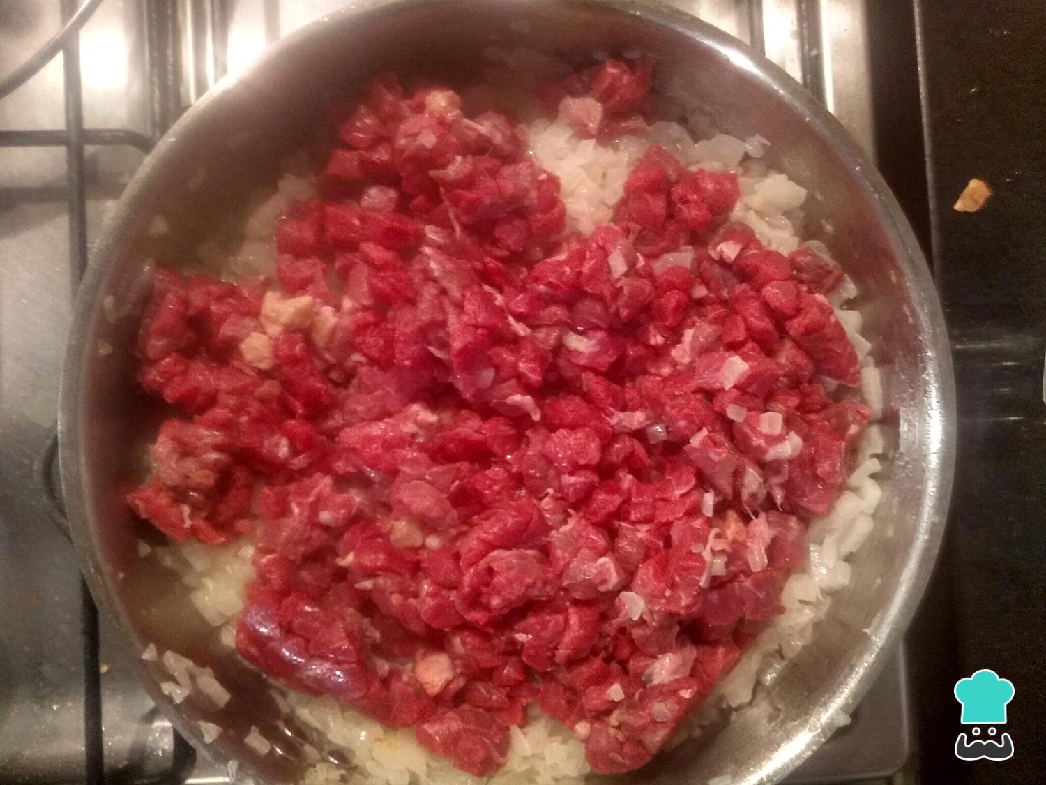 Pica finamente la cebolla y corta la carne en cuadraditos pequeños en caso de no usar carne molida.