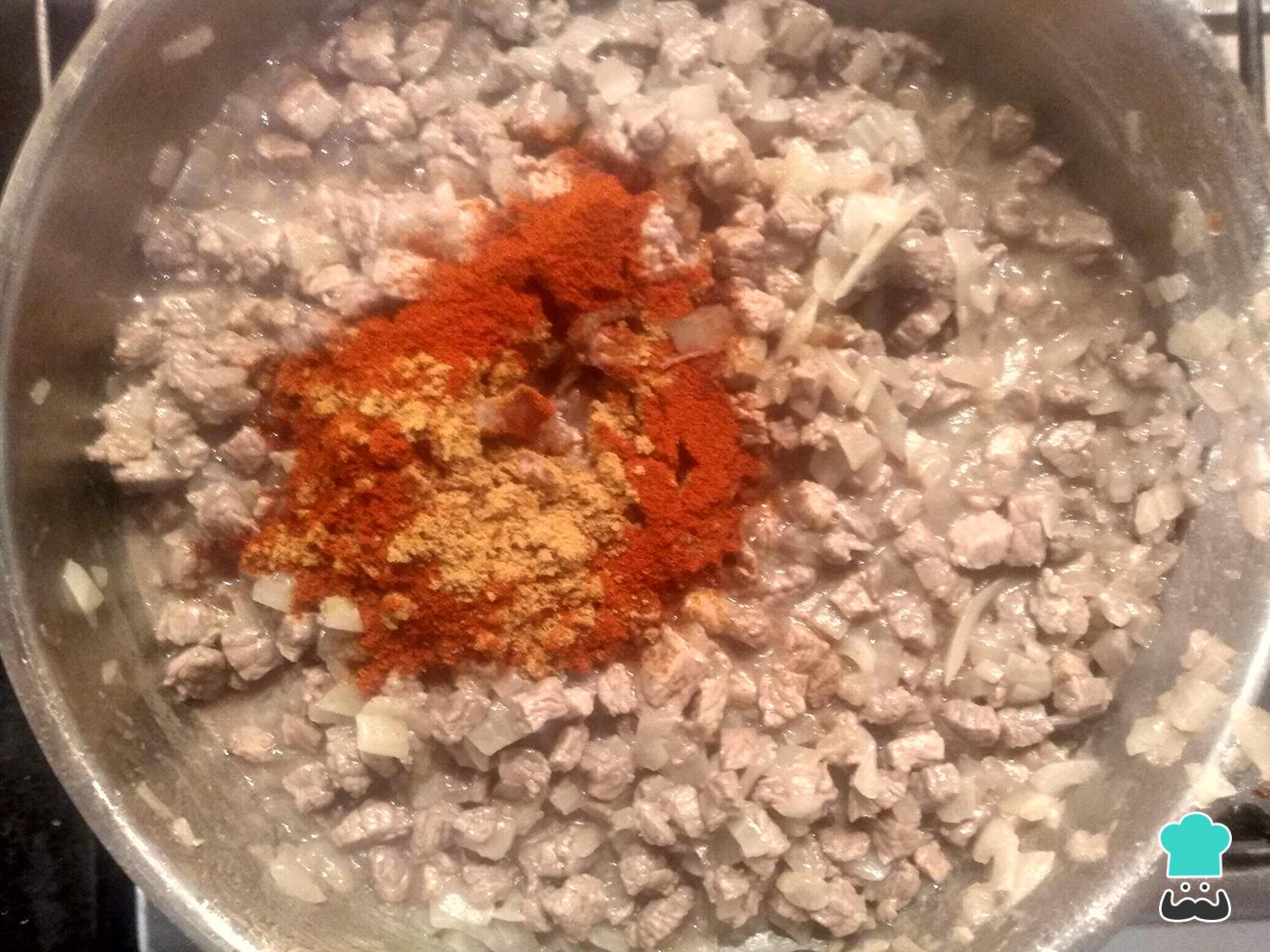 Cuando las cebollas estén listas, agrega la carne. Otro truco para conseguir unas empanadas criollas jugosas es no cocinar la carne del todo, solo durante un par de minutos a fuego fuerte y retiramos, casi como si fuese un sellado (sellar es cocinar por fuera pero no por dentro).