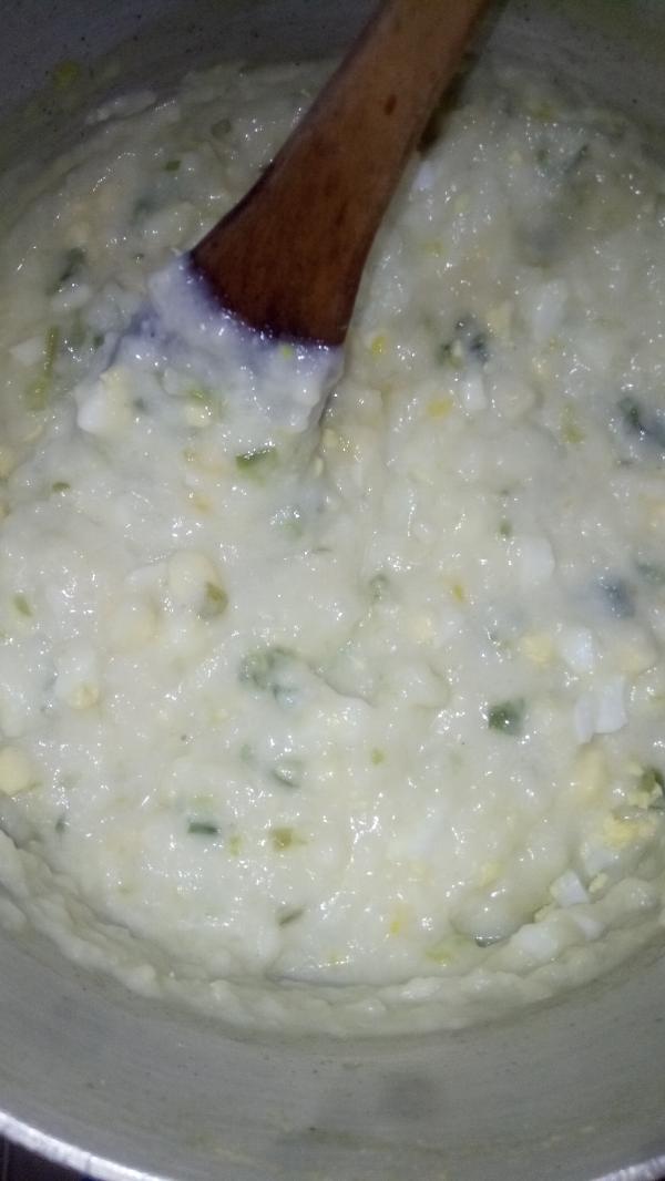 Cuando la preparación esté lista, añade sal y pimienta al gusto y retírala del fuego. Añade los huevos cocidos picados y deja que se enfríe.