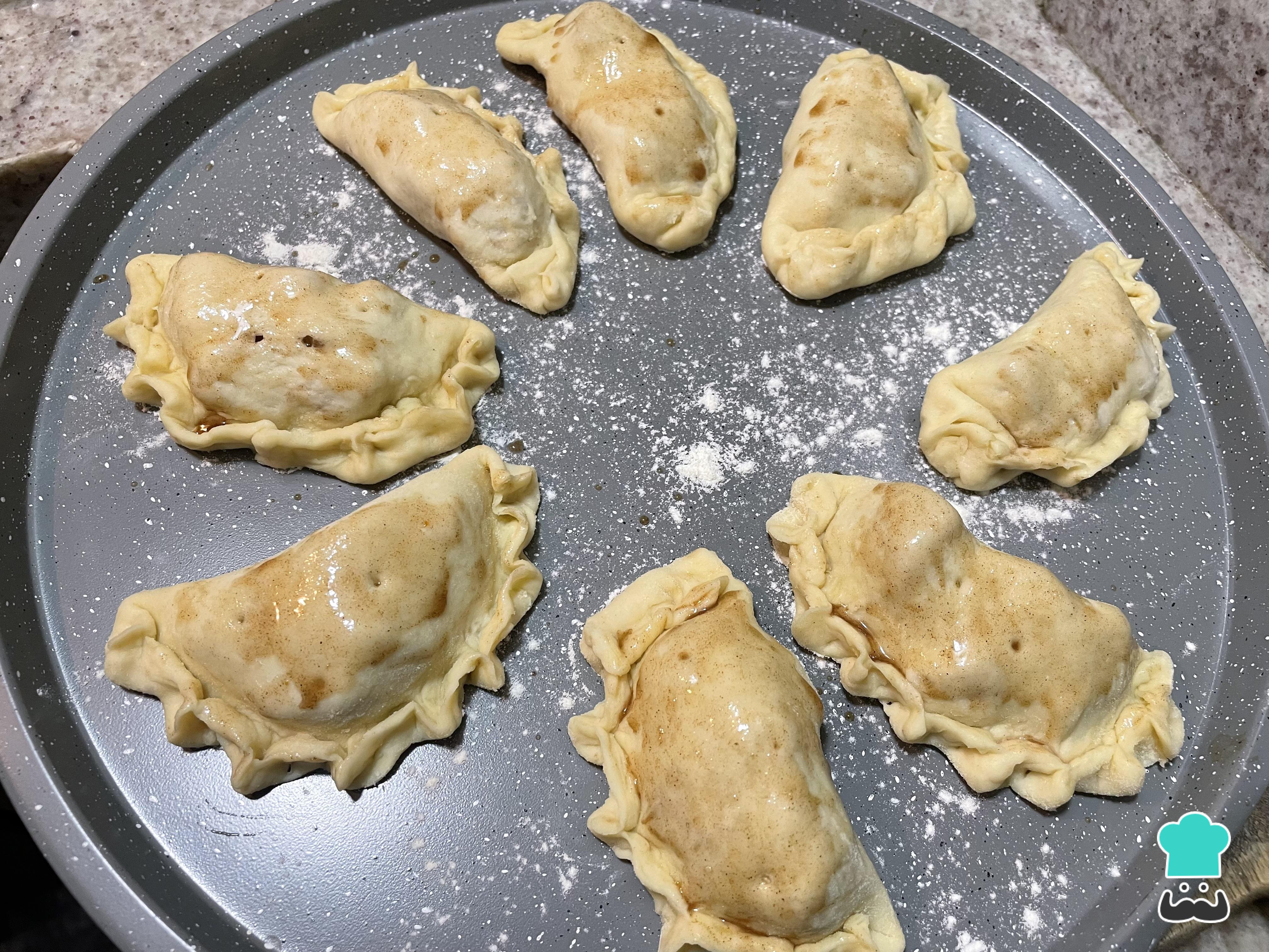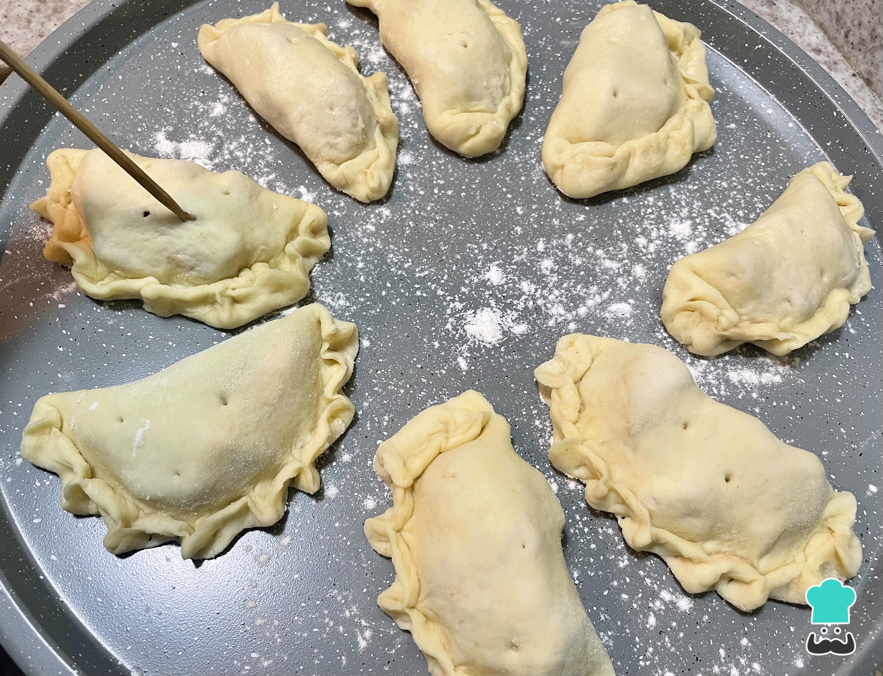 Coloca las empanadas en una bandeja de horno previamente enharinada para que no se peguen y realiza pequeños agujeros con un palito de madera en cada empanada.