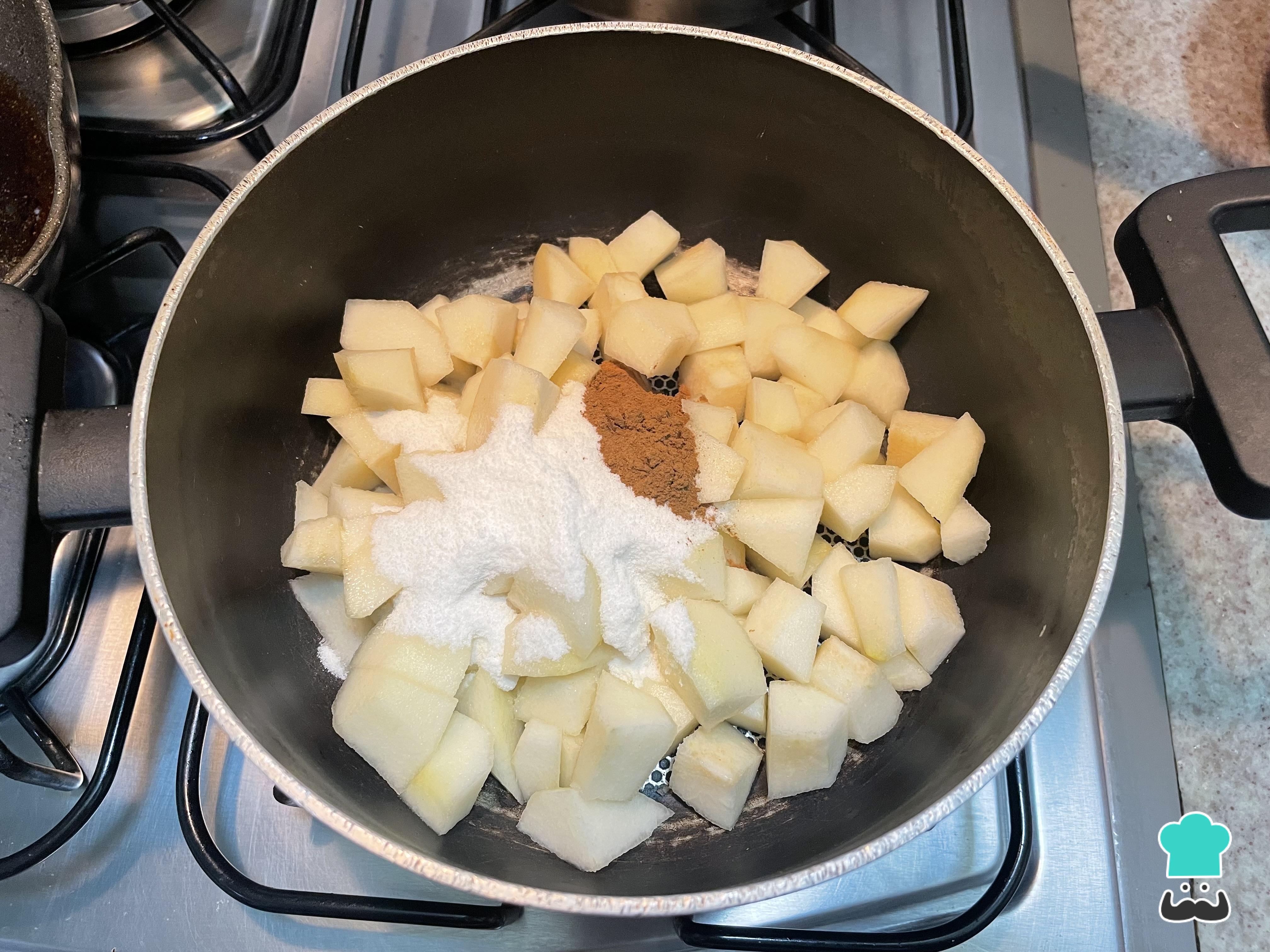 Coloca en una olla las peras picadas, el azúcar y la canela. Si deseas, puedes añadir una cucharada de agua para ayudar al proceso de cocción.