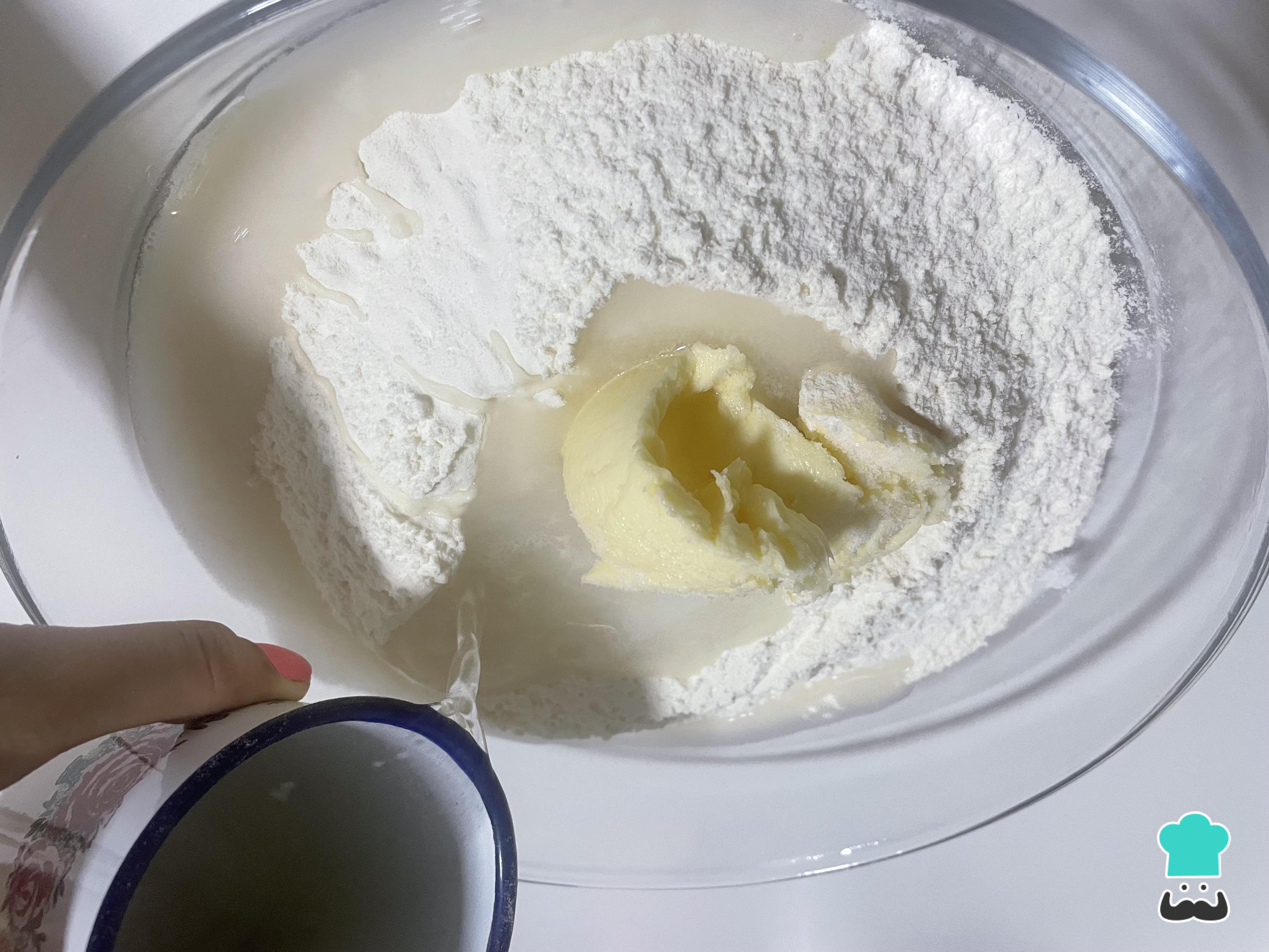 Prepara la masa. En un bol, mezcla la harina, la sal, la margarina y el agua caliente con cuidado de no quemarte.