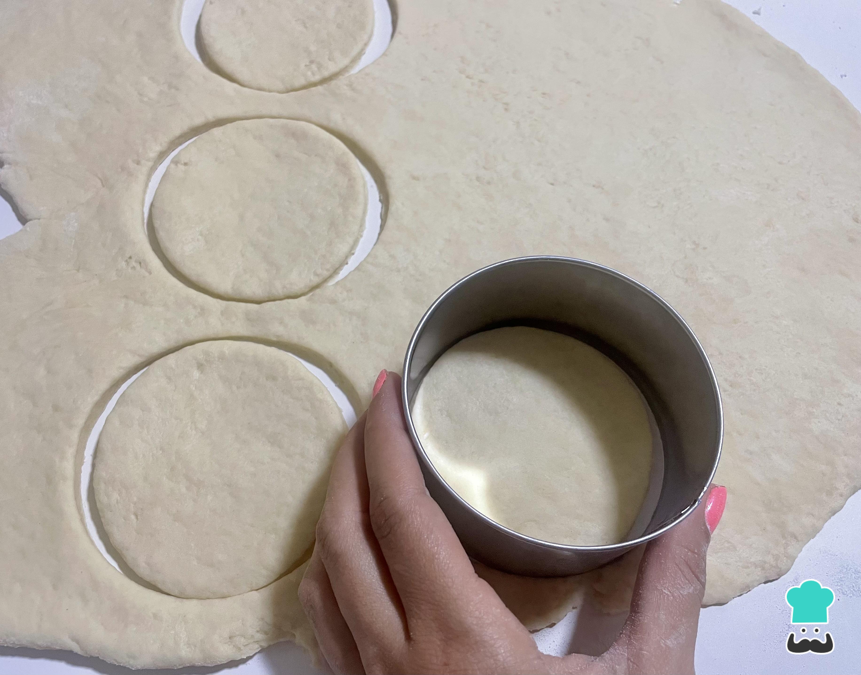 Estira la masa con un rodillo y corta en círculos. Puedes usar un cortador de empanadas, un plato hondo o un vaso grande como guía.