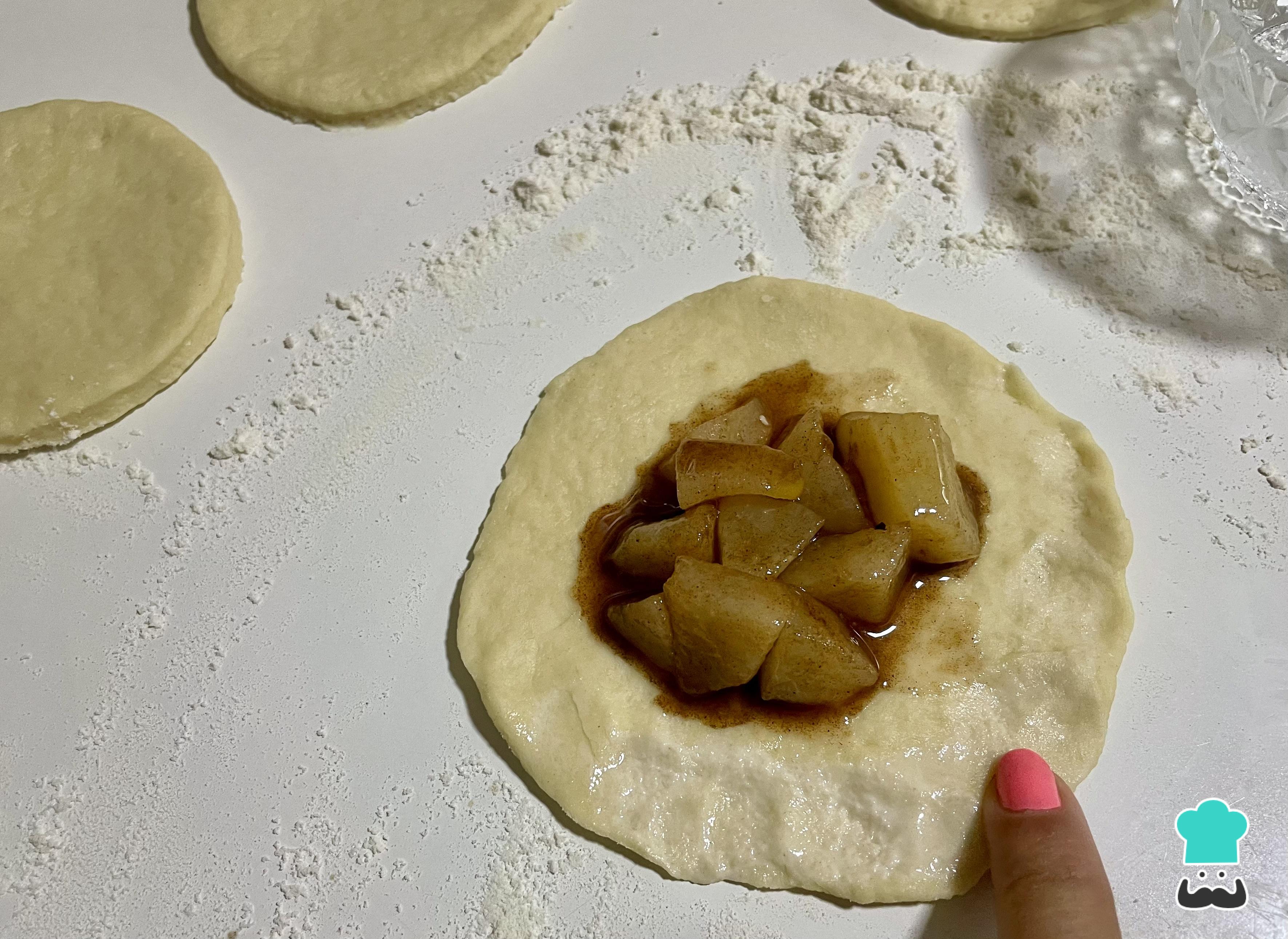 Vuelve a estirar cada círculo de masa de empanadas de pera para que quede más delgado. Luego, agrega una cucharada del relleno en el centro y moja ligeramente los bordes con agua.