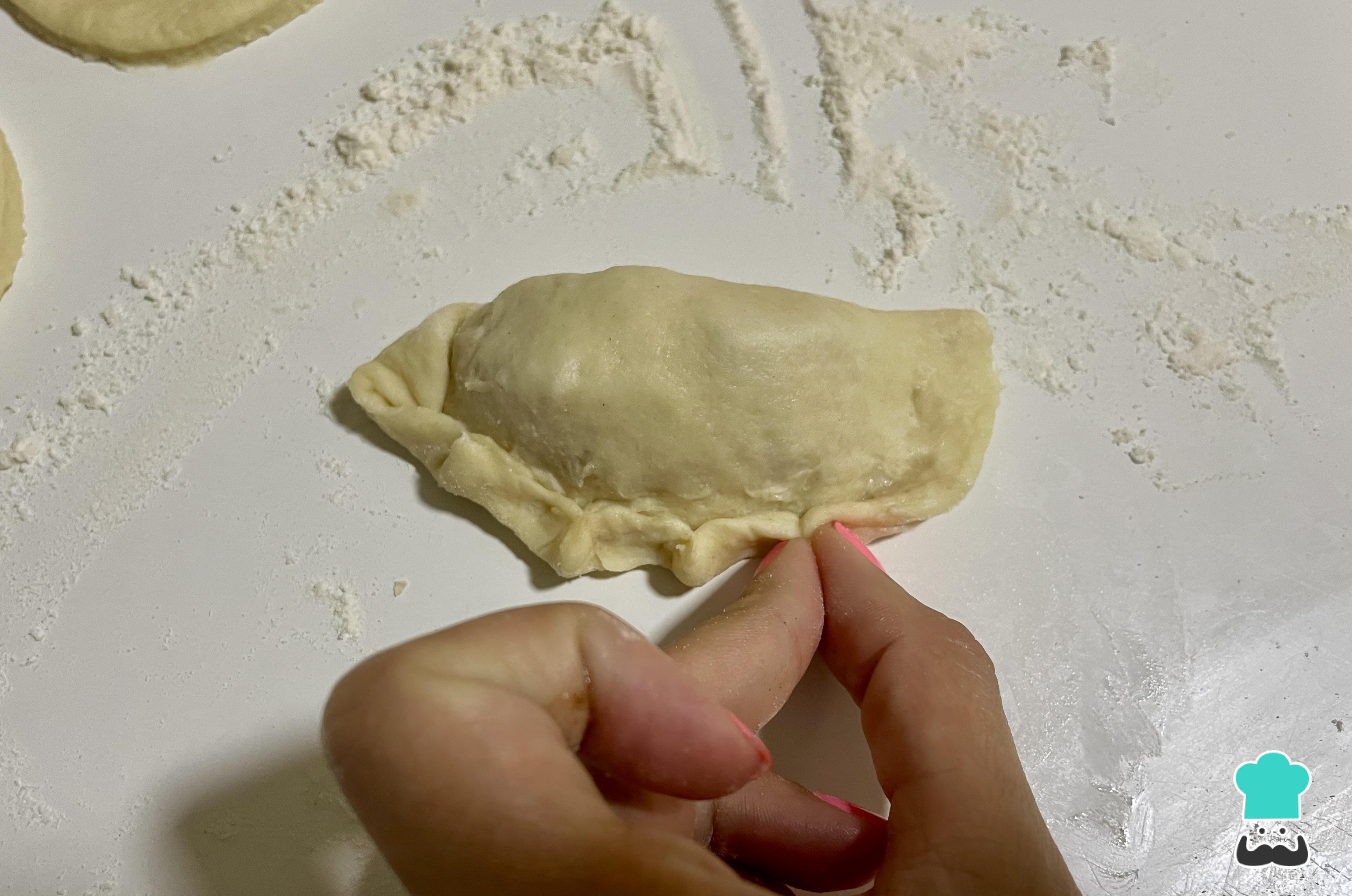 Cierra la empanada y presiona los bordes. Puedes hacer pequeños dobleces o usar un tenedor para sellarlas.