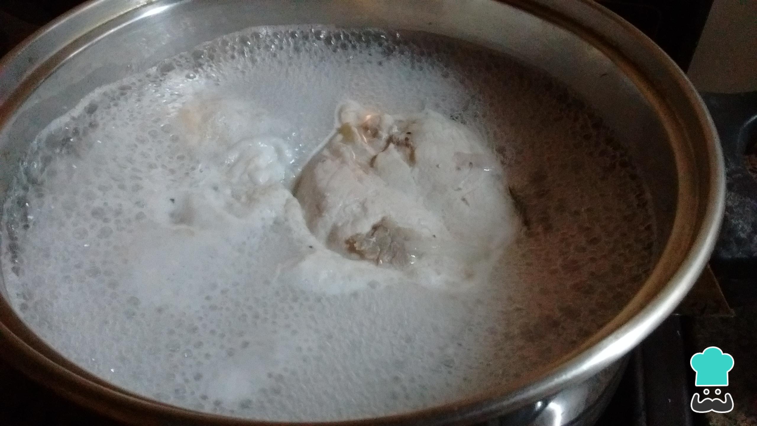 Para empezar con la preparación de estas ricas empanadas de pollo, debes cocinar el pollo en el caldo casero. Aproximadamente llevará unos 30 minutos de cocción. Recomendamos que estés pendiente de ello para que no se cocine de más, de esta forma, tus empanadas quedarían algo secas. No te preocupes, pues la cocción podrás completarla en el horno.