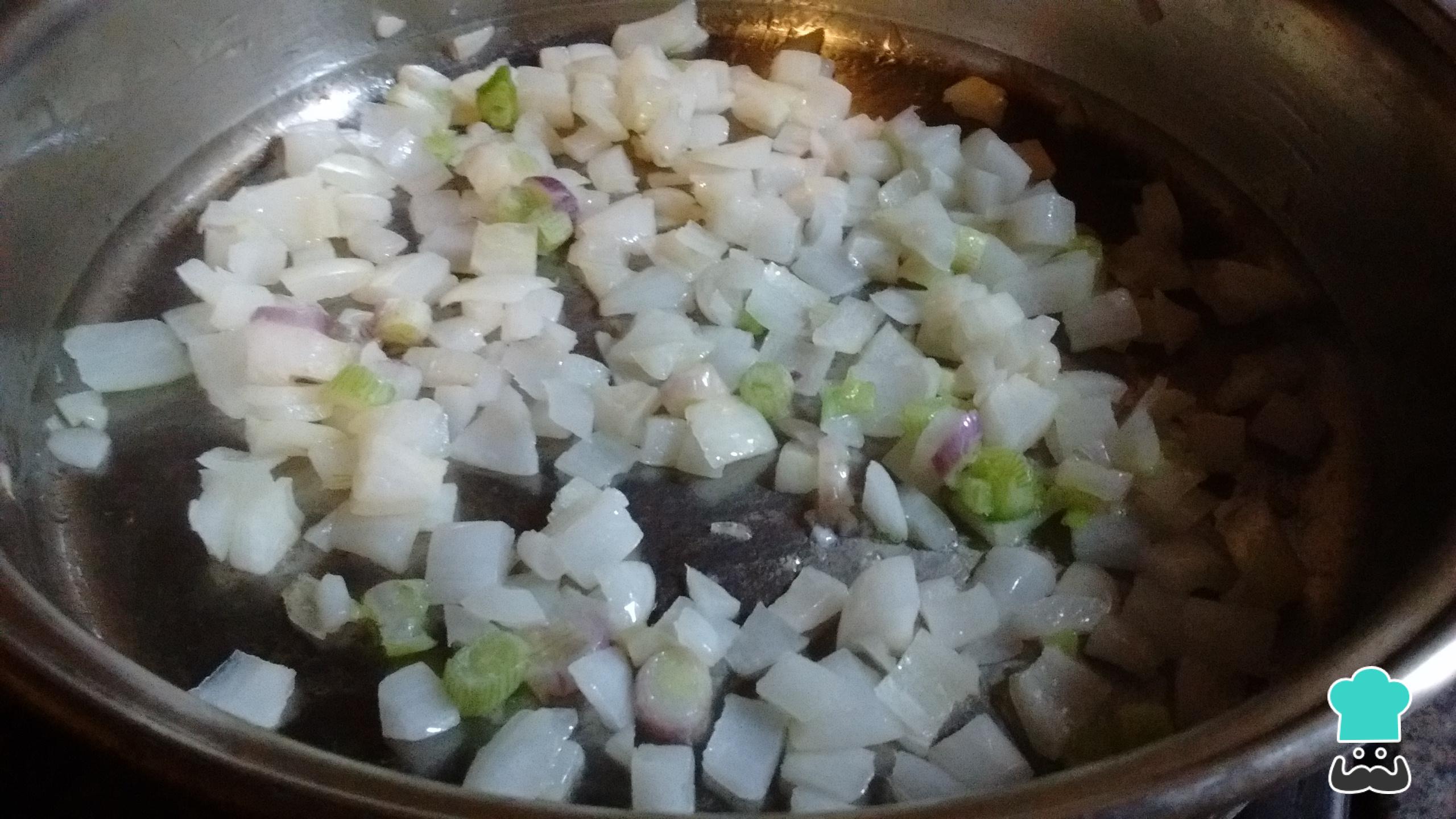 Mientras se cocina el pollo, debes pelar y picar la cebolla, tanto la común como la de verdeo. Debes reservar la parte verde para más tarde. Seguidamente, saltéala en una sartén con 1 cucharada de aceite a fuego medio hasta que sea transparente. Puedes utilizar una cucharada de agua caliente para levantar el fondo de cocción y evitar que las cebollas se quemen. Cuando estén cocidas, retíralas del fuego.