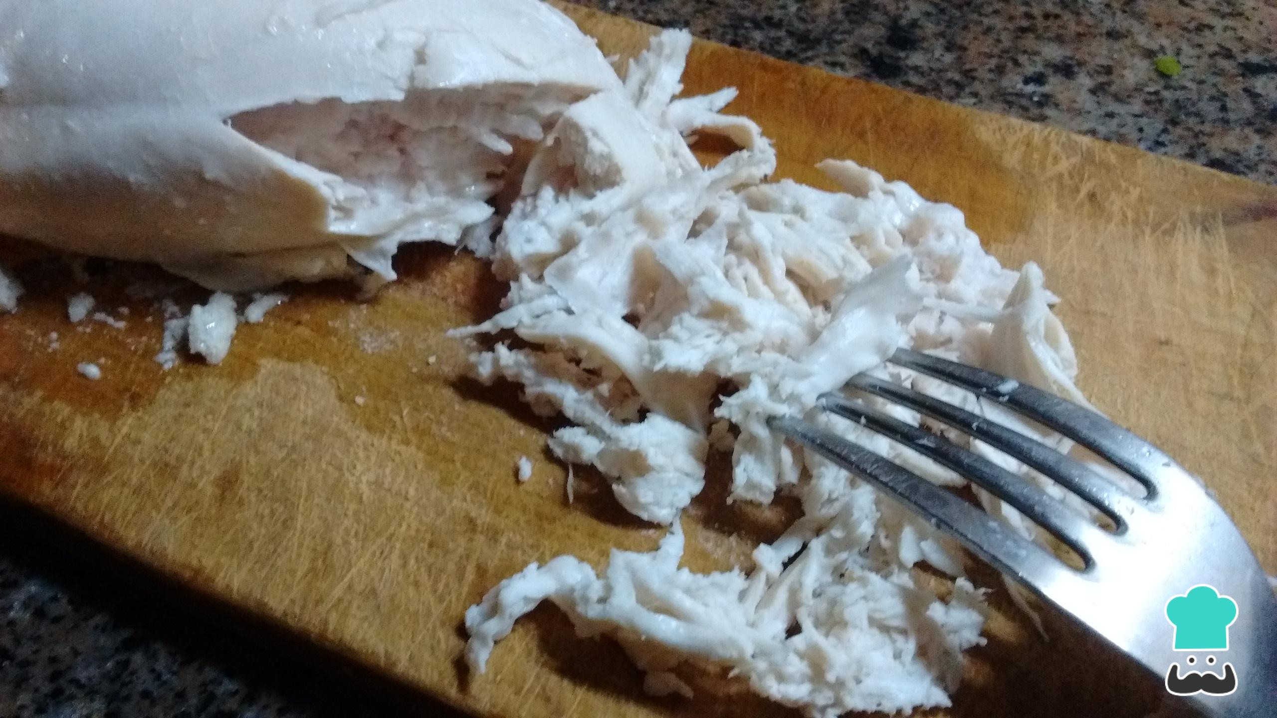 Cuando el pollo esté cocido, es el momento de desmenuzarlo con la ayuda de dos tenedores, y así hacer el picadillo de pollo para empanadas.