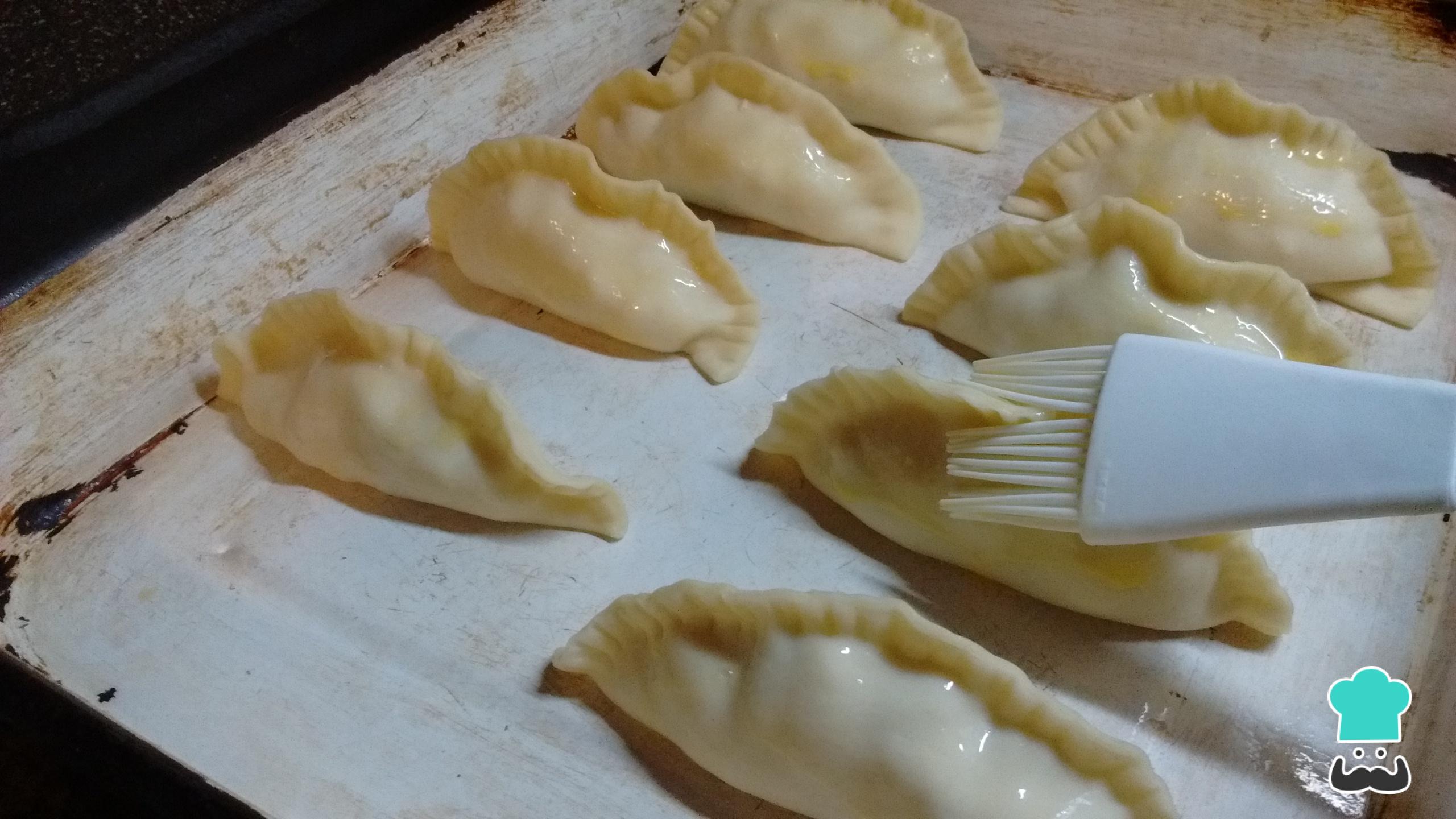 Por último, colócalas en una asadera previamente engrasada y píntalas con huevo. Recomendamos que las acomodes con el cierre hacia arriba, así tanto la base como los costados se dorarán de forma pareja. Debes cocinarlas en el horno precalentado a 200-220 °C por unos 20 minutos o hasta que la masa esté bien dorada.